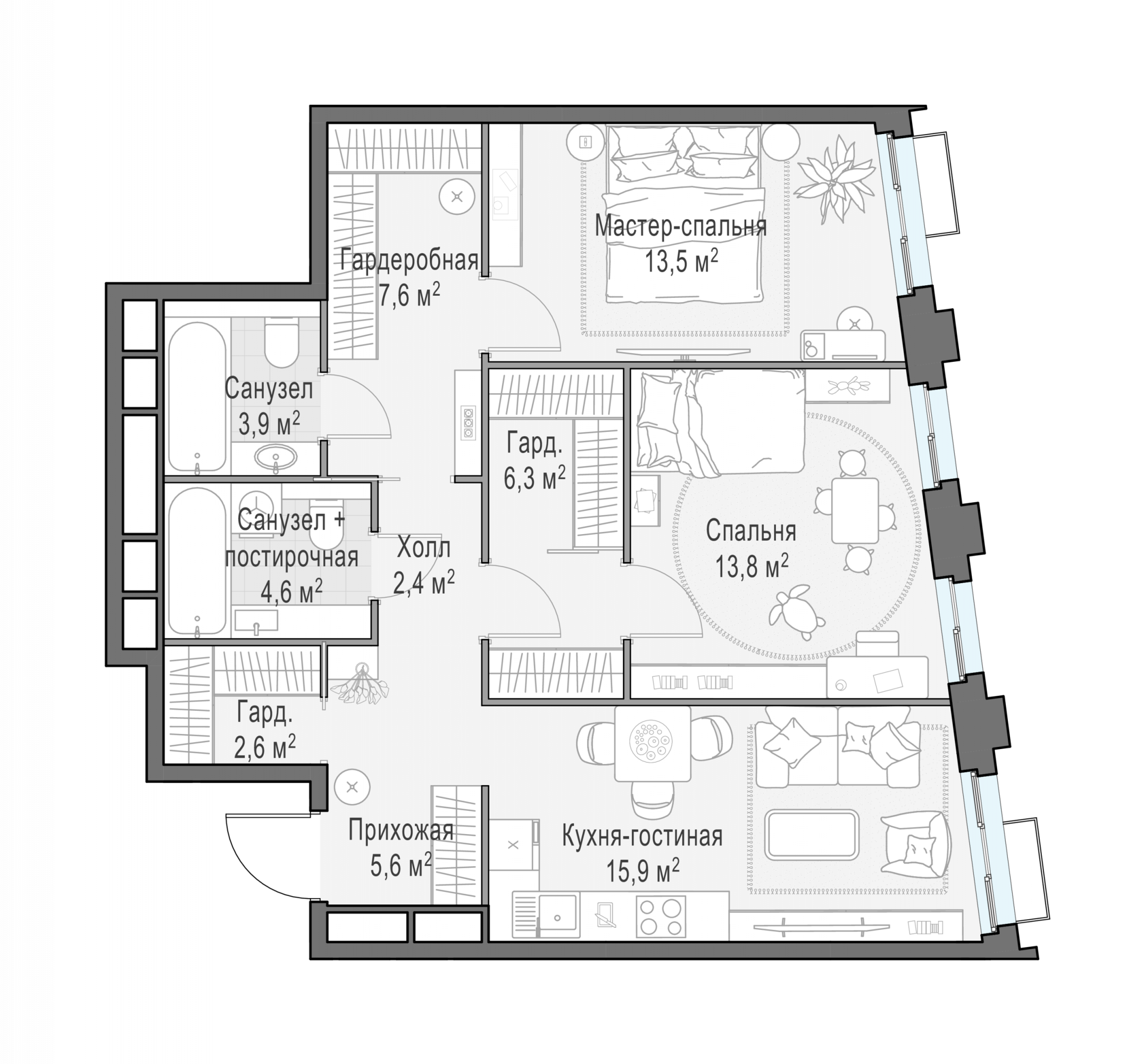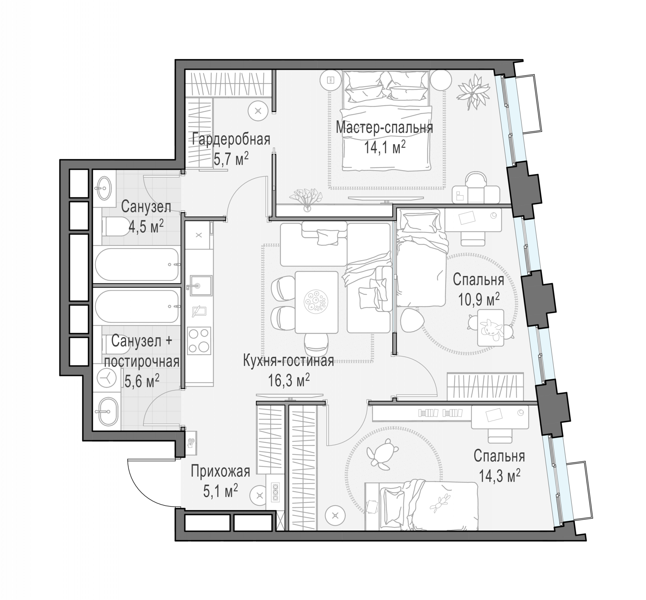 Представленные планировочные решения носят иллюстративный характер. Застройщик передаёт объект с планировкой, указанной в договоре участия в долевом строительстве. Любая перепланировка должна соответствовать требованиям государственных органов.