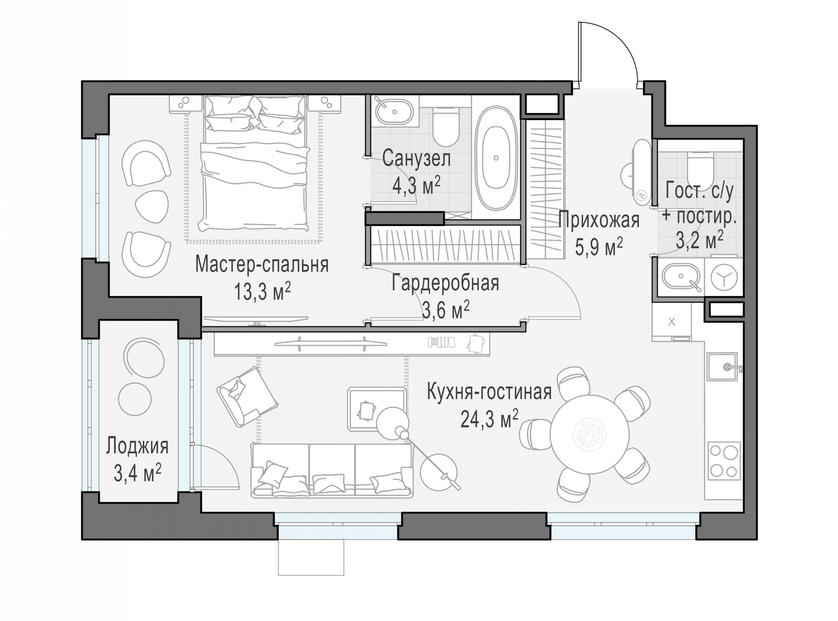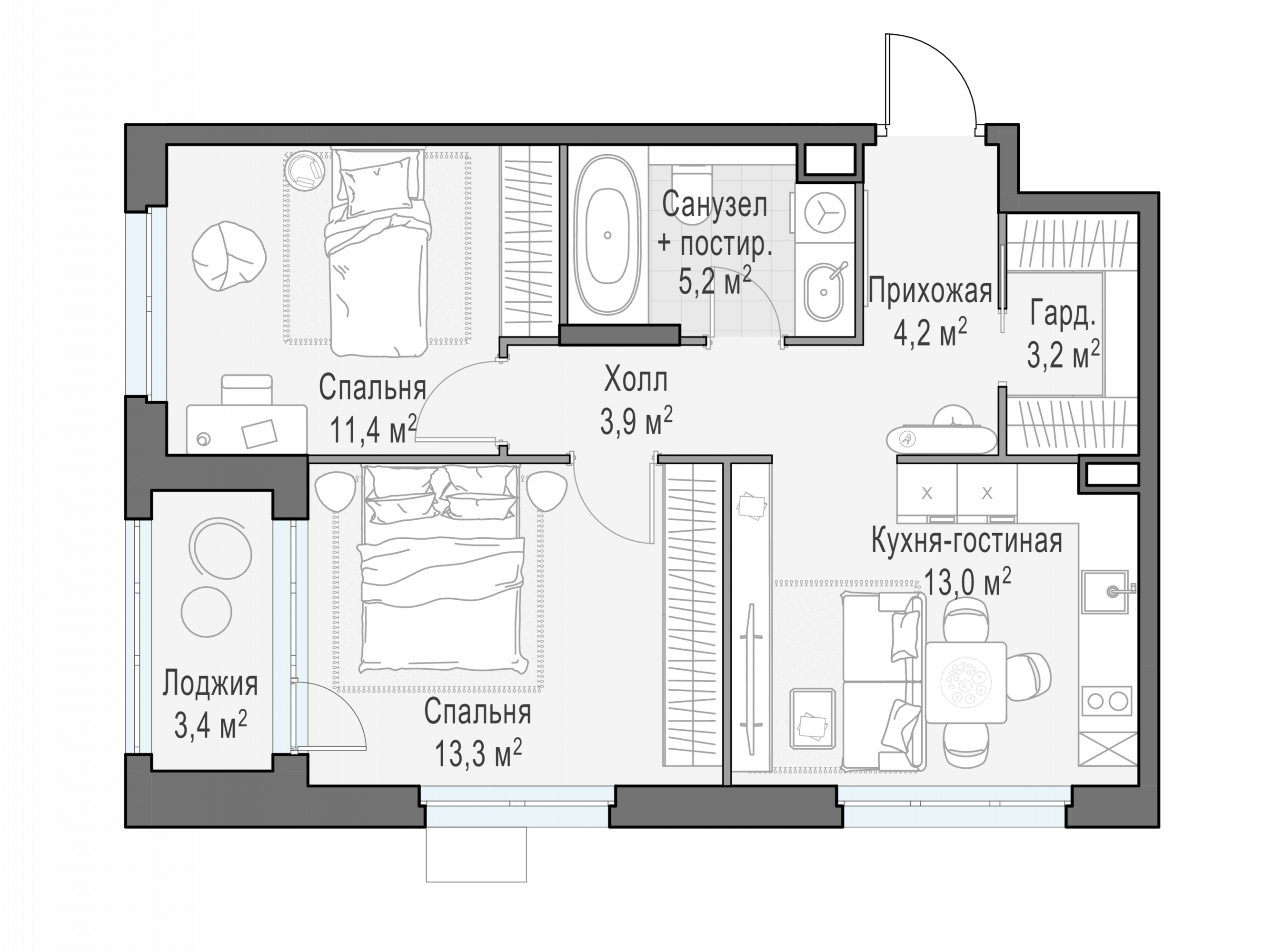 Представленные планировочные решения носят иллюстративный характер. Застройщик передаёт объект с планировкой, указанной в договоре участия в долевом строительстве. Любая перепланировка должна соответствовать требованиям государственных органов.