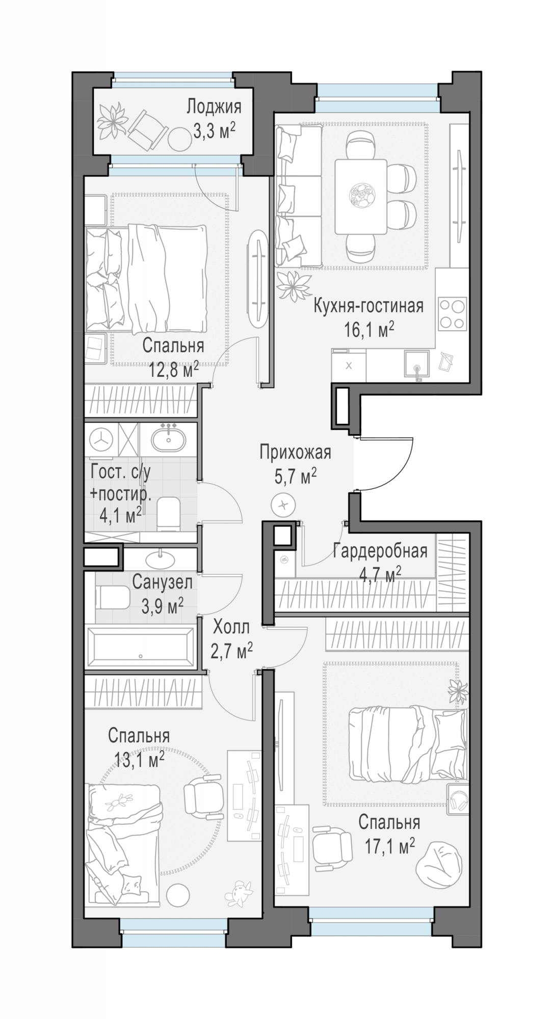 Представленные планировочные решения носят иллюстративный характер. Застройщик передаёт объект с планировкой, указанной в договоре участия в долевом строительстве. Любая перепланировка должна соответствовать требованиям государственных органов.
