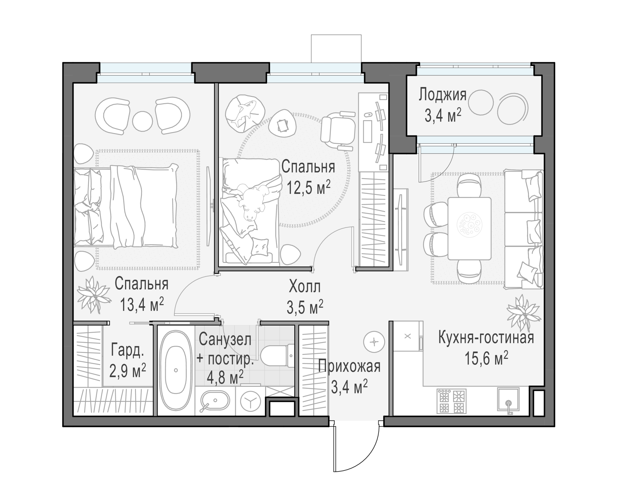 Представленные планировочные решения носят иллюстративный характер. Застройщик передаёт объект с планировкой, указанной в договоре участия в долевом строительстве. Любая перепланировка должна соответствовать требованиям государственных органов.