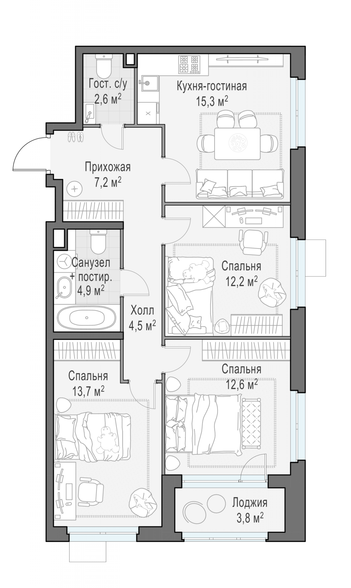 Представленные планировочные решения носят иллюстративный характер. Застройщик передаёт объект с планировкой, указанной в договоре участия в долевом строительстве. Любая перепланировка должна соответствовать требованиям государственных органов.