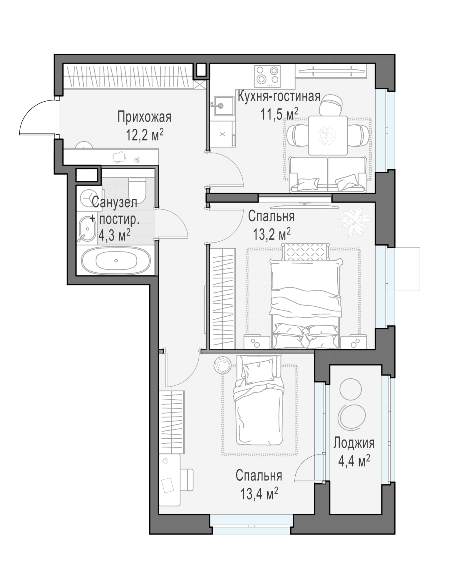 Представленные планировочные решения носят иллюстративный характер. Застройщик передаёт объект с планировкой, указанной в договоре участия в долевом строительстве. Любая перепланировка должна соответствовать требованиям государственных органов.