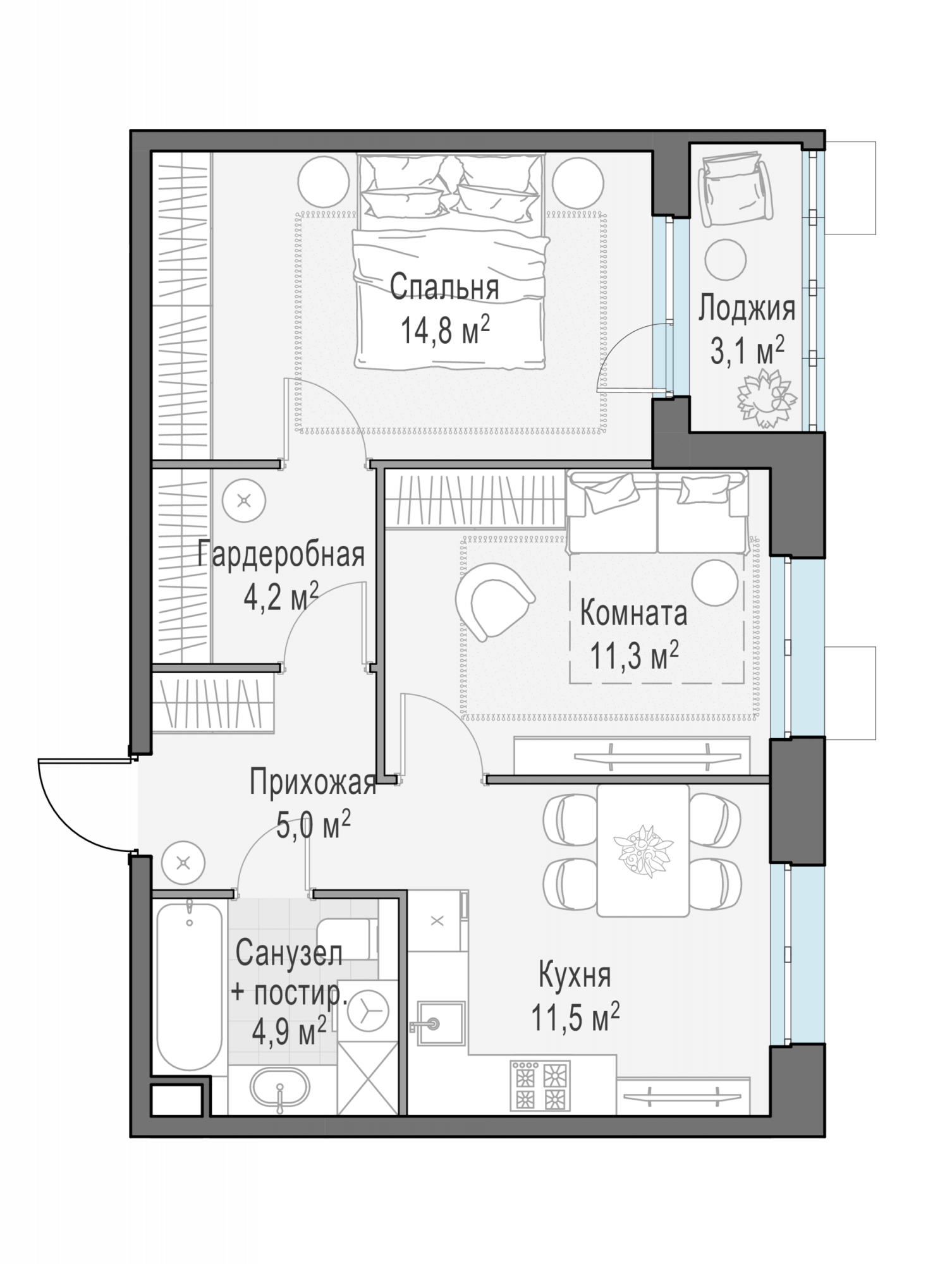 Представленные планировочные решения носят иллюстративный характер. Застройщик передаёт объект с планировкой, указанной в договоре участия в долевом строительстве. Любая перепланировка должна соответствовать требованиям государственных органов.