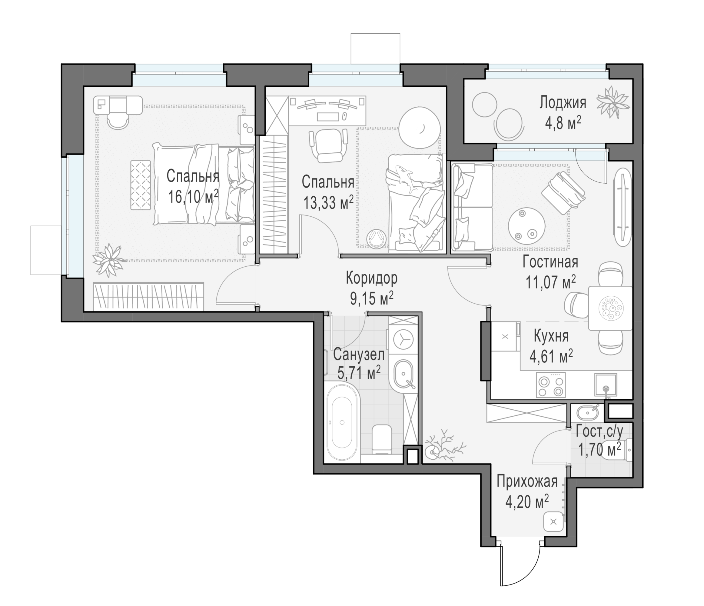 Представленные планировочные решения носят иллюстративный характер. Застройщик передаёт объект с планировкой, указанной в договоре участия в долевом строительстве. Любая перепланировка должна соответствовать требованиям государственных органов.
