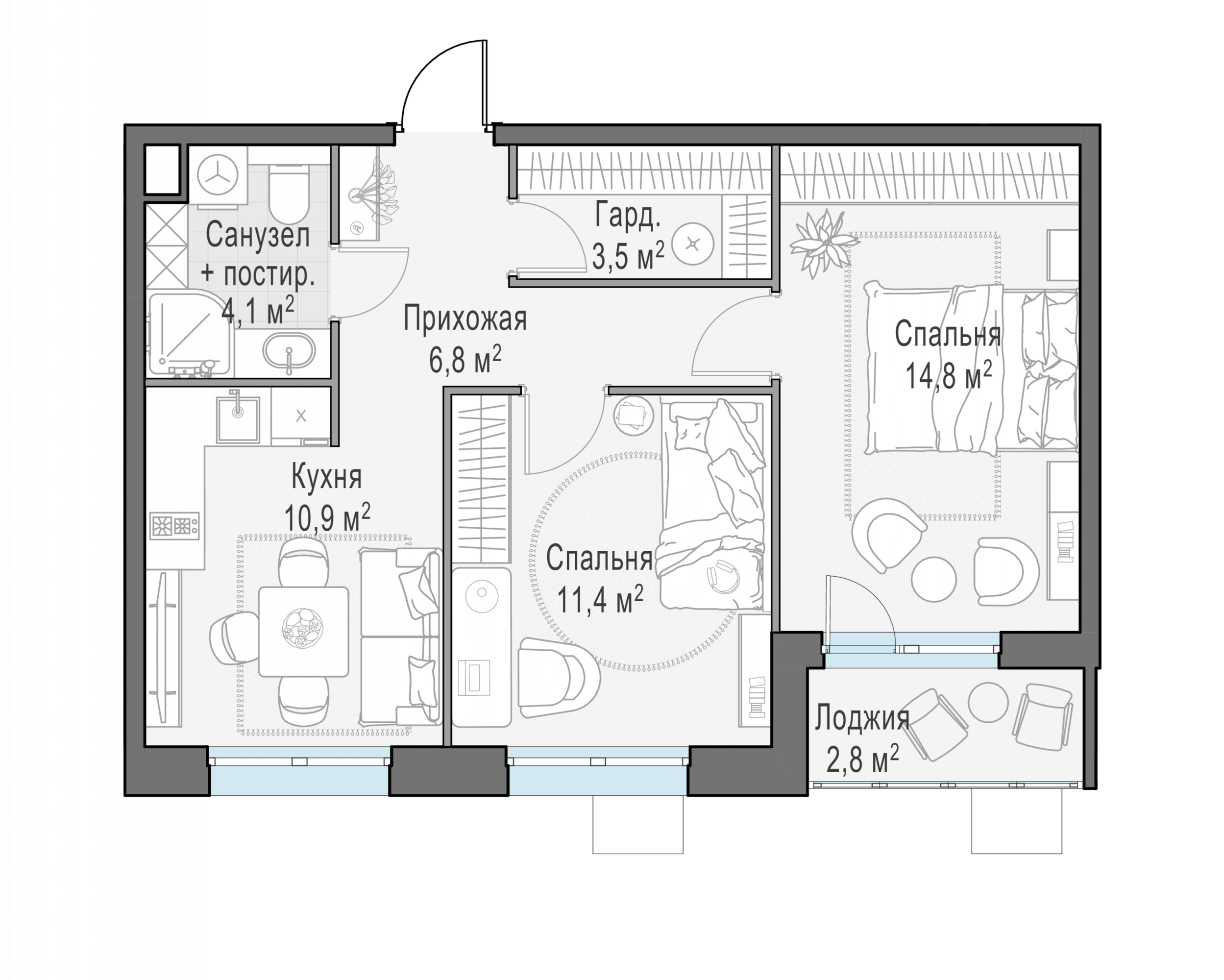 Представленные планировочные решения носят иллюстративный характер. Застройщик передаёт объект с планировкой, указанной в договоре участия в долевом строительстве. Любая перепланировка должна соответствовать требованиям государственных органов.