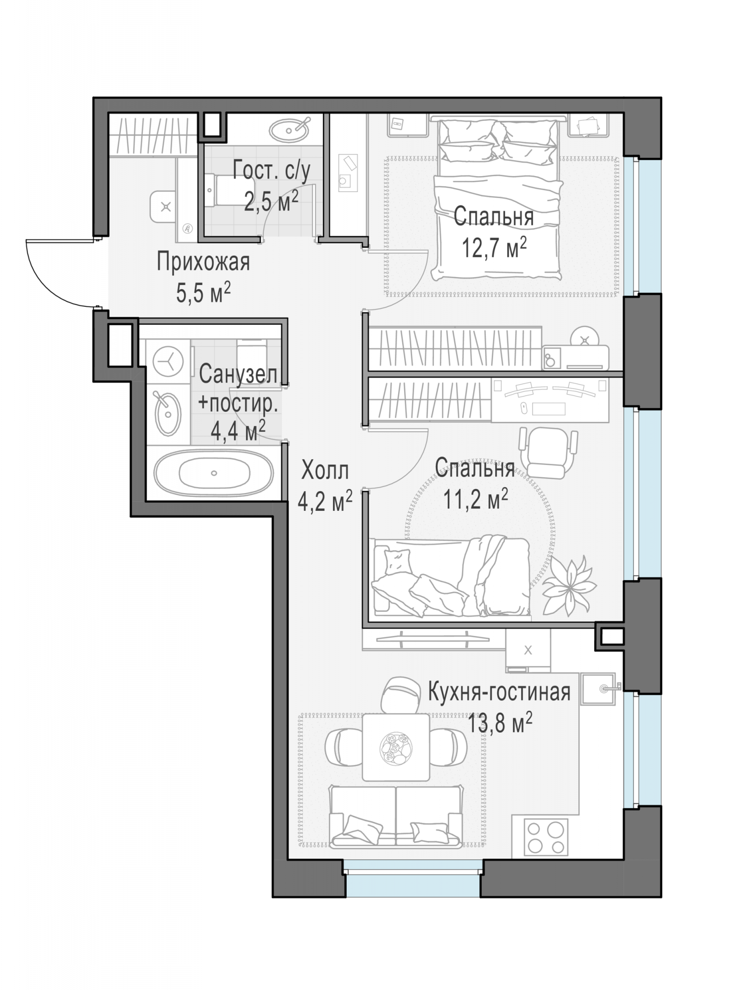 Представленные планировочные решения носят иллюстративный характер. Застройщик передаёт объект с планировкой, указанной в договоре участия в долевом строительстве. Любая перепланировка должна соответствовать требованиям государственных органов.