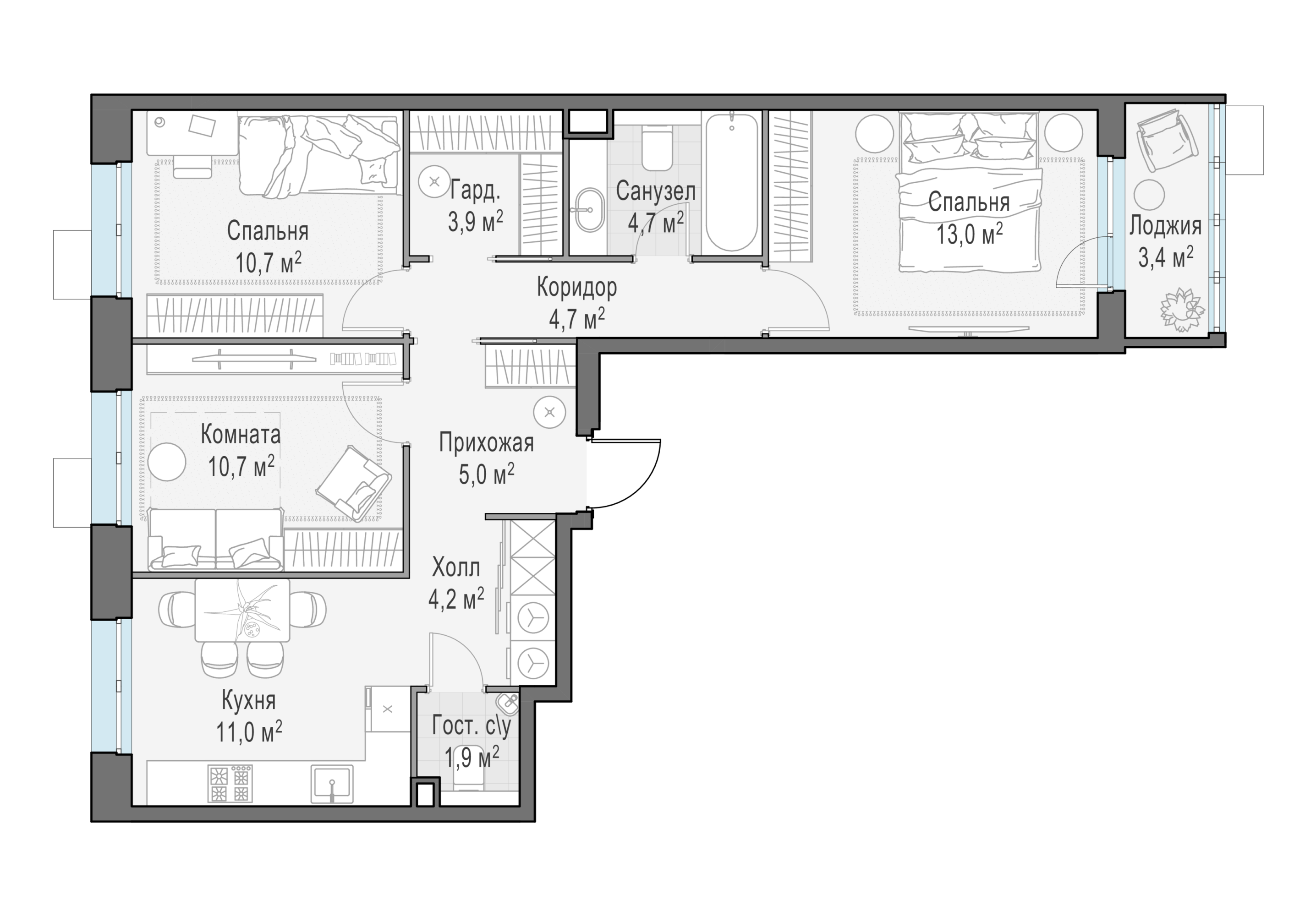 Представленные планировочные решения носят иллюстративный характер. Застройщик передаёт объект с планировкой, указанной в договоре участия в долевом строительстве. Любая перепланировка должна соответствовать требованиям государственных органов.