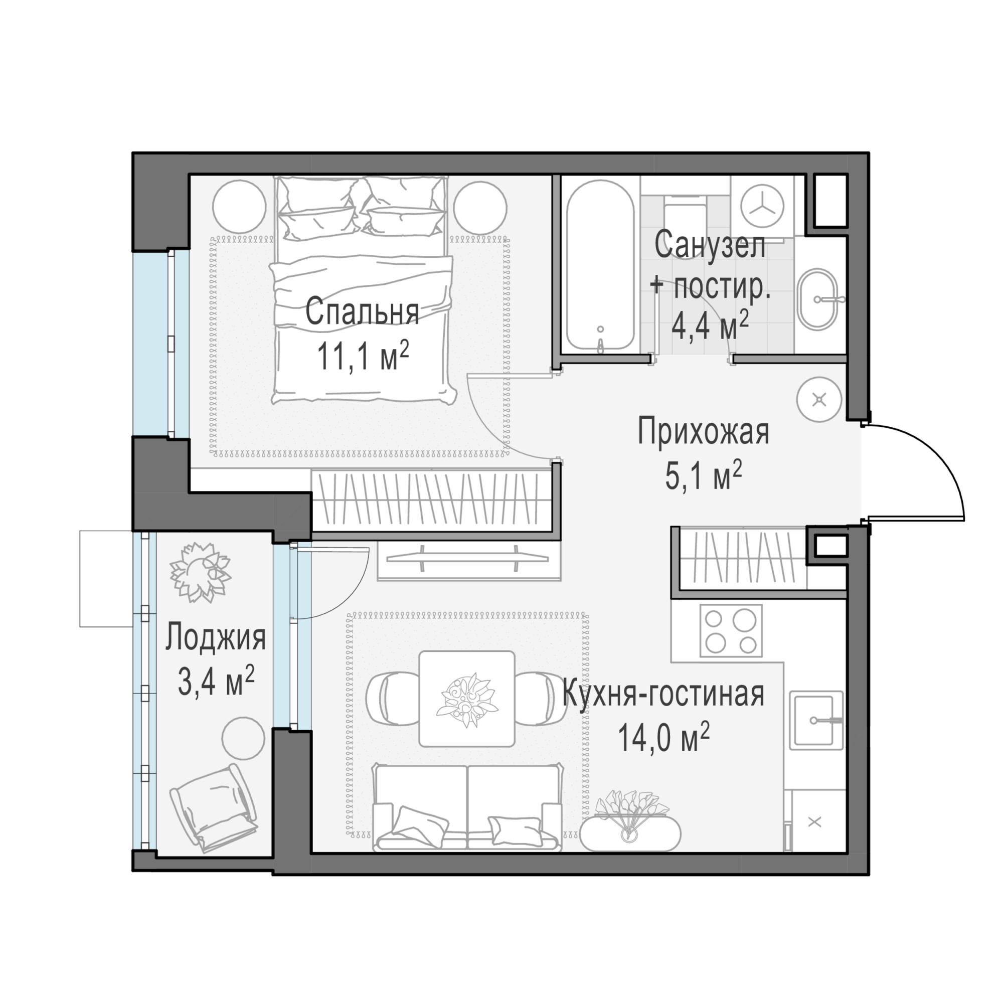 Представленные планировочные решения носят иллюстративный характер. Застройщик передаёт объект с планировкой, указанной в договоре участия в долевом строительстве. Любая перепланировка должна соответствовать требованиям государственных органов.