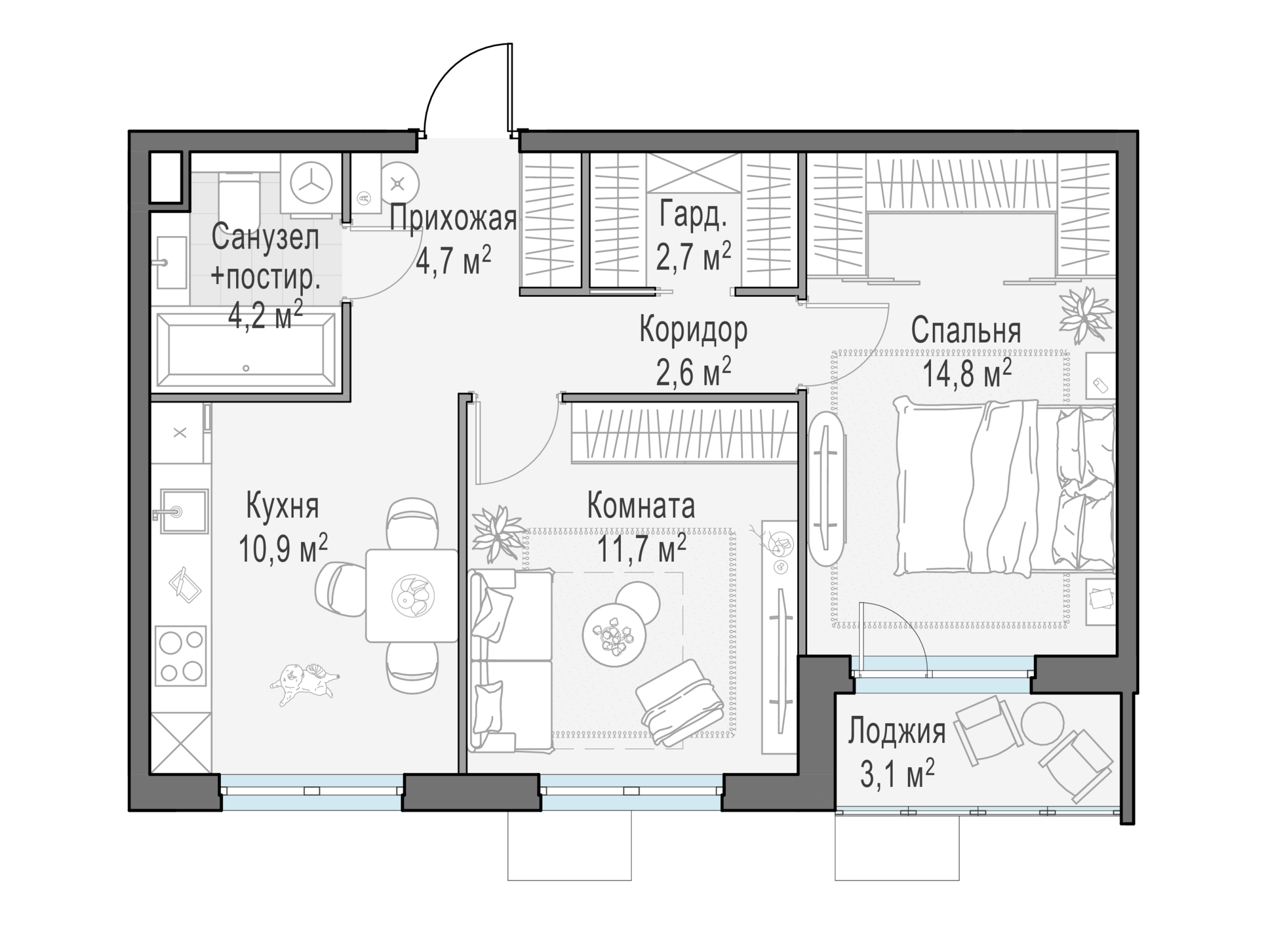 Представленные планировочные решения носят иллюстративный характер. Застройщик передаёт объект с планировкой, указанной в договоре участия в долевом строительстве. Любая перепланировка должна соответствовать требованиям государственных органов.