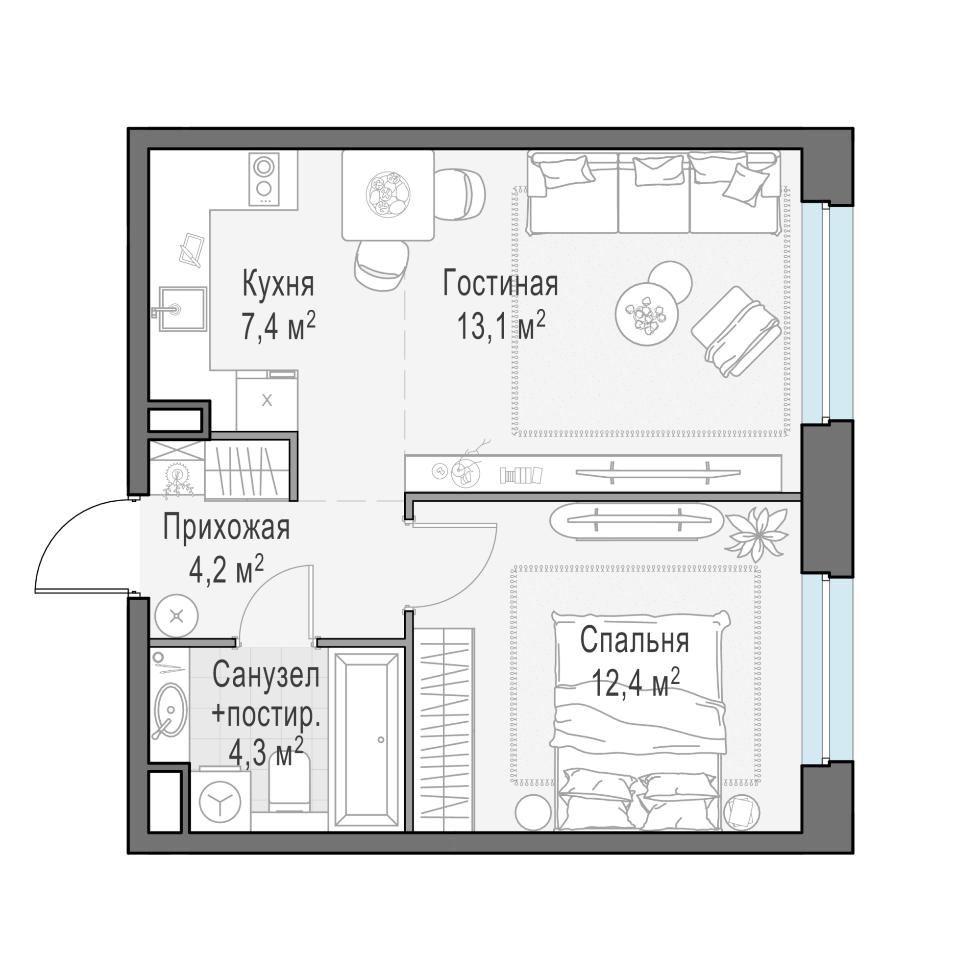 Представленные планировочные решения носят иллюстративный характер. Застройщик передаёт объект с планировкой, указанной в договоре участия в долевом строительстве. Любая перепланировка должна соответствовать требованиям государственных органов.