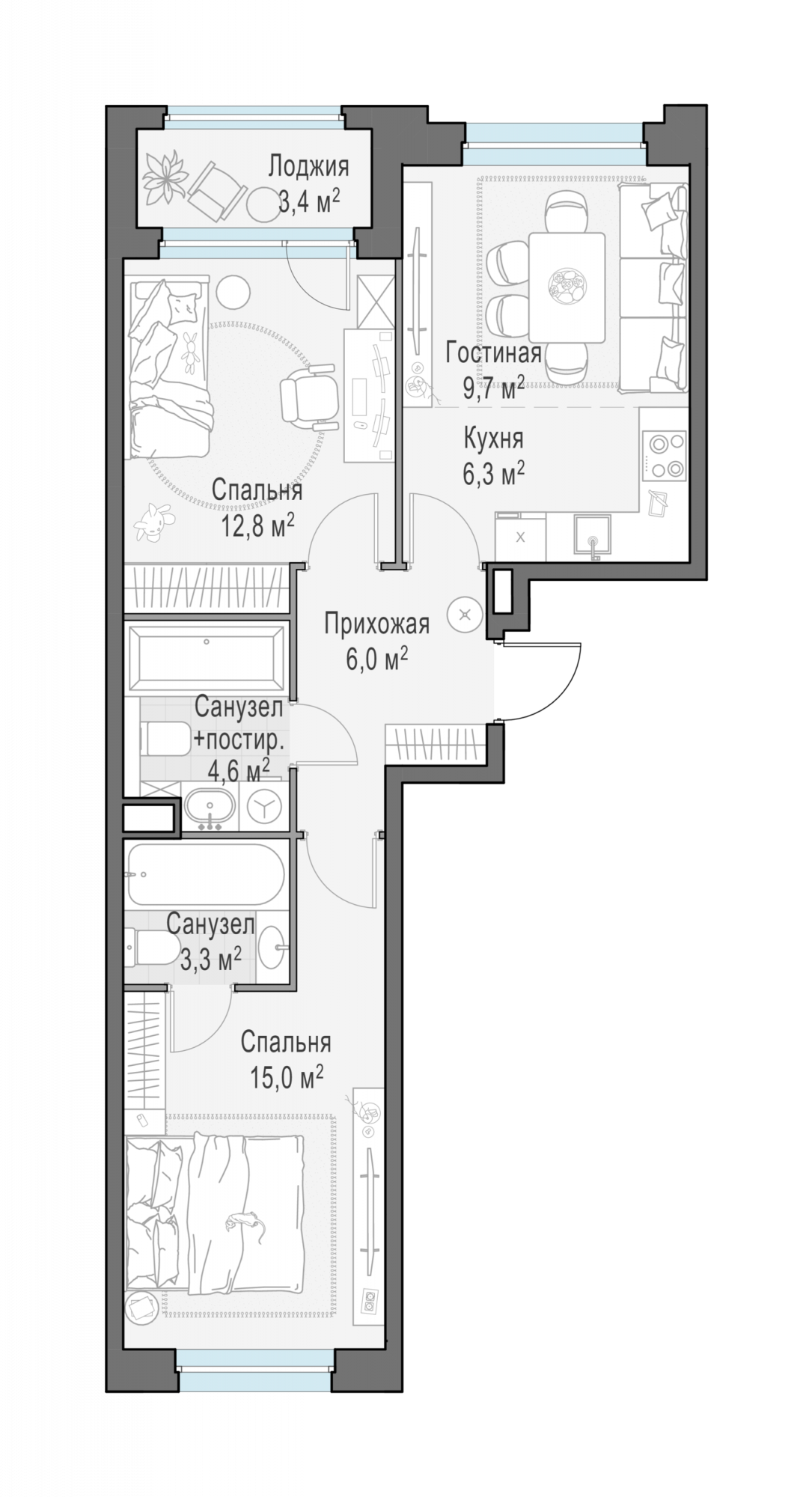 Представленные планировочные решения носят иллюстративный характер. Застройщик передаёт объект с планировкой, указанной в договоре участия в долевом строительстве. Любая перепланировка должна соответствовать требованиям государственных органов.