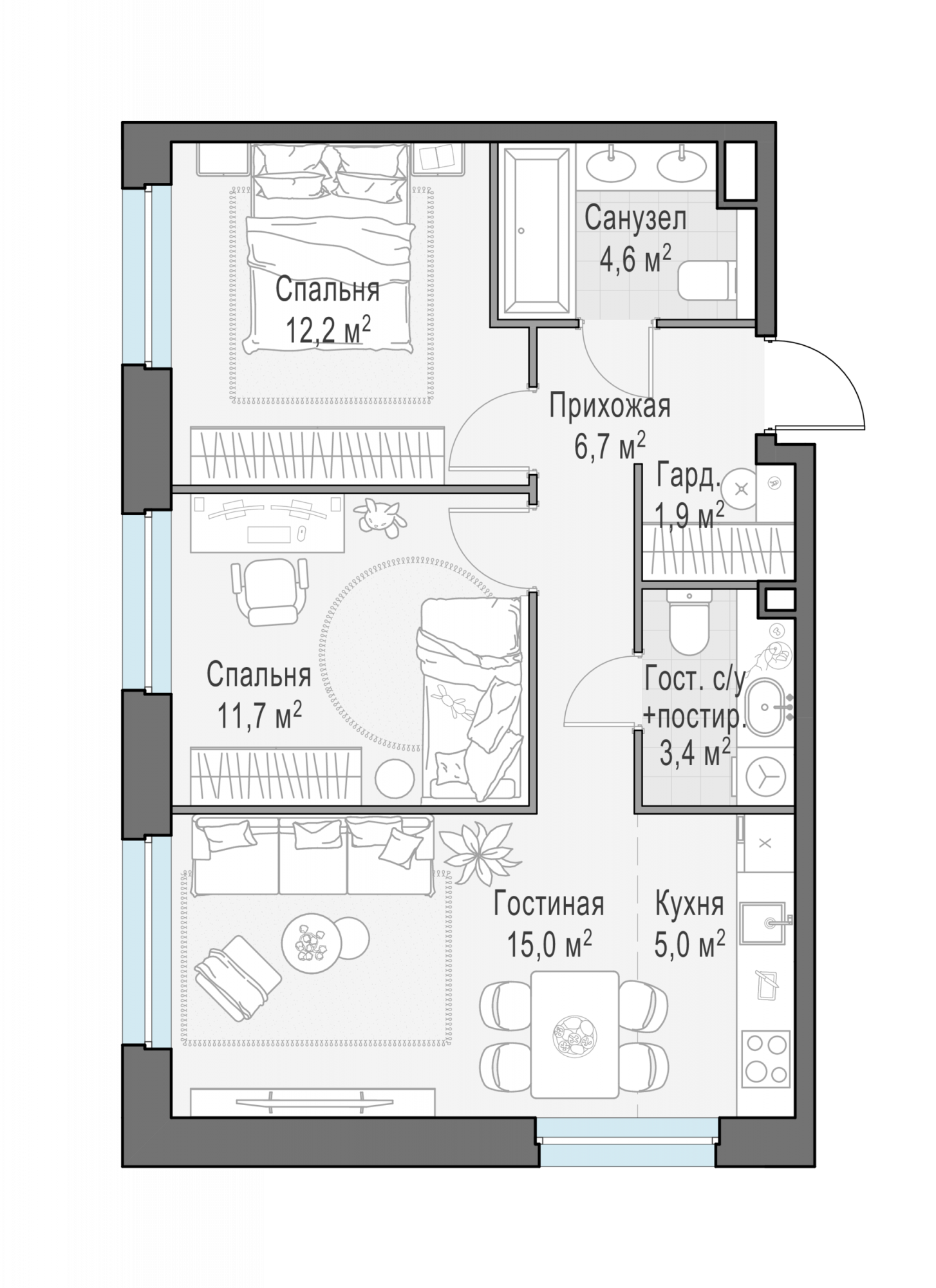 Представленные планировочные решения носят иллюстративный характер. Застройщик передаёт объект с планировкой, указанной в договоре участия в долевом строительстве. Любая перепланировка должна соответствовать требованиям государственных органов.