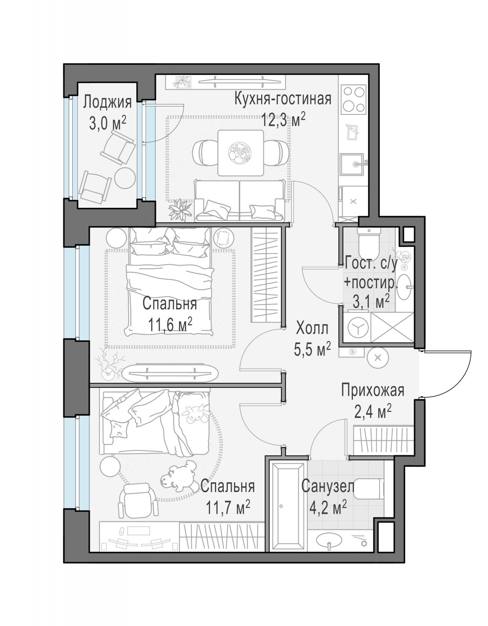 Представленные планировочные решения носят иллюстративный характер. Застройщик передаёт объект с планировкой, указанной в договоре участия в долевом строительстве. Любая перепланировка должна соответствовать требованиям государственных органов.
