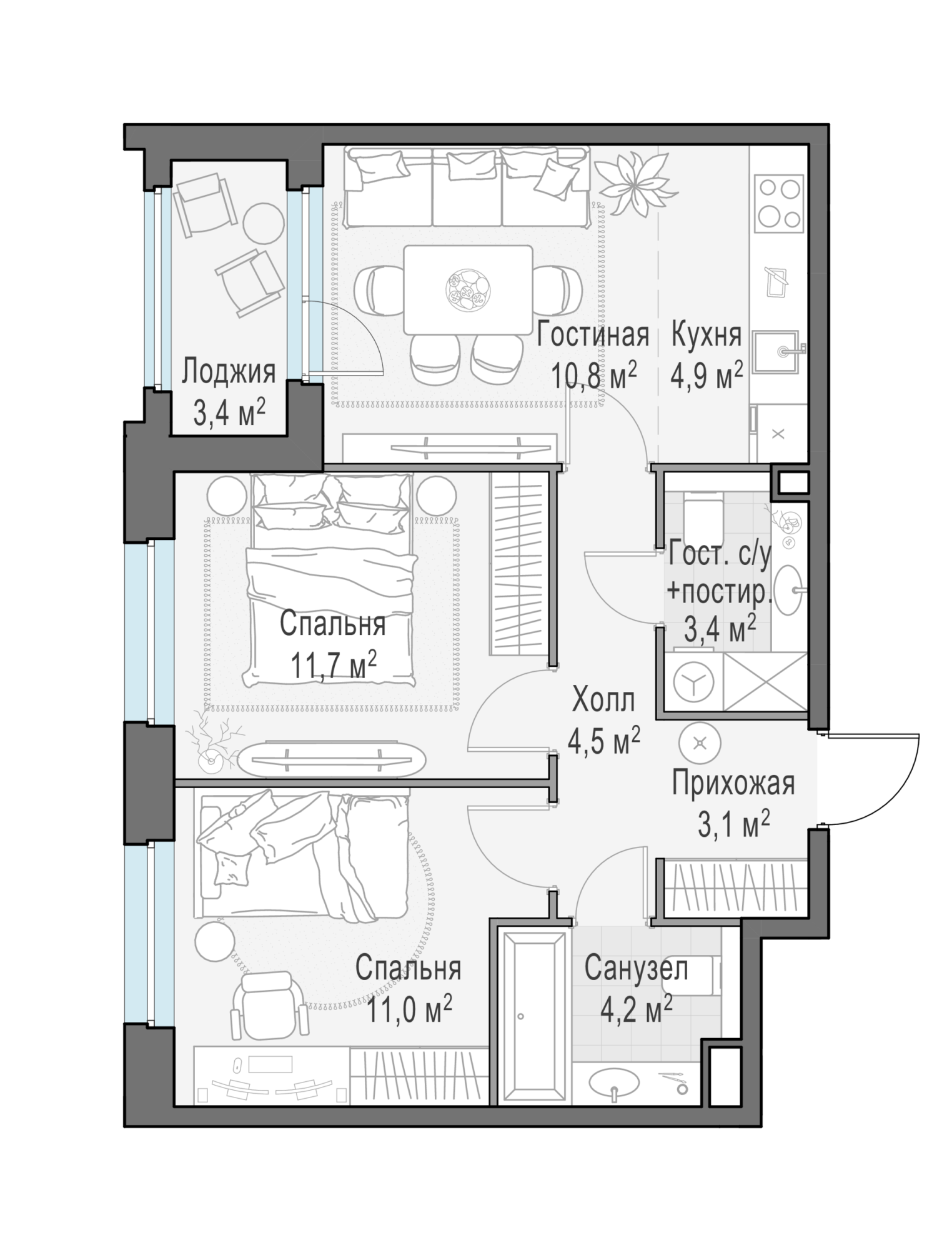 Представленные планировочные решения носят иллюстративный характер. Застройщик передаёт объект с планировкой, указанной в договоре участия в долевом строительстве. Любая перепланировка должна соответствовать требованиям государственных органов.
