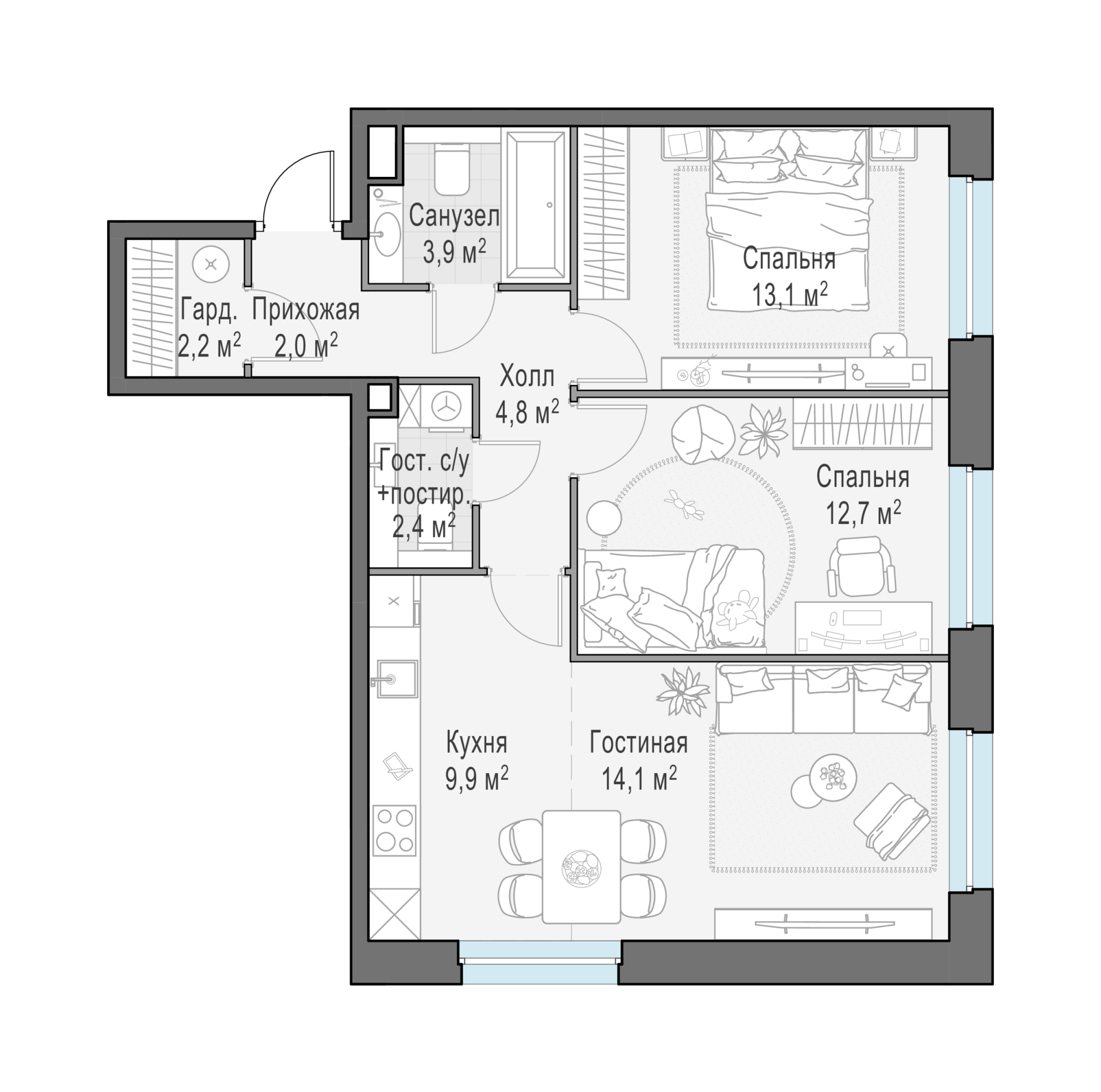 Представленные планировочные решения носят иллюстративный характер. Застройщик передаёт объект с планировкой, указанной в договоре участия в долевом строительстве. Любая перепланировка должна соответствовать требованиям государственных органов.