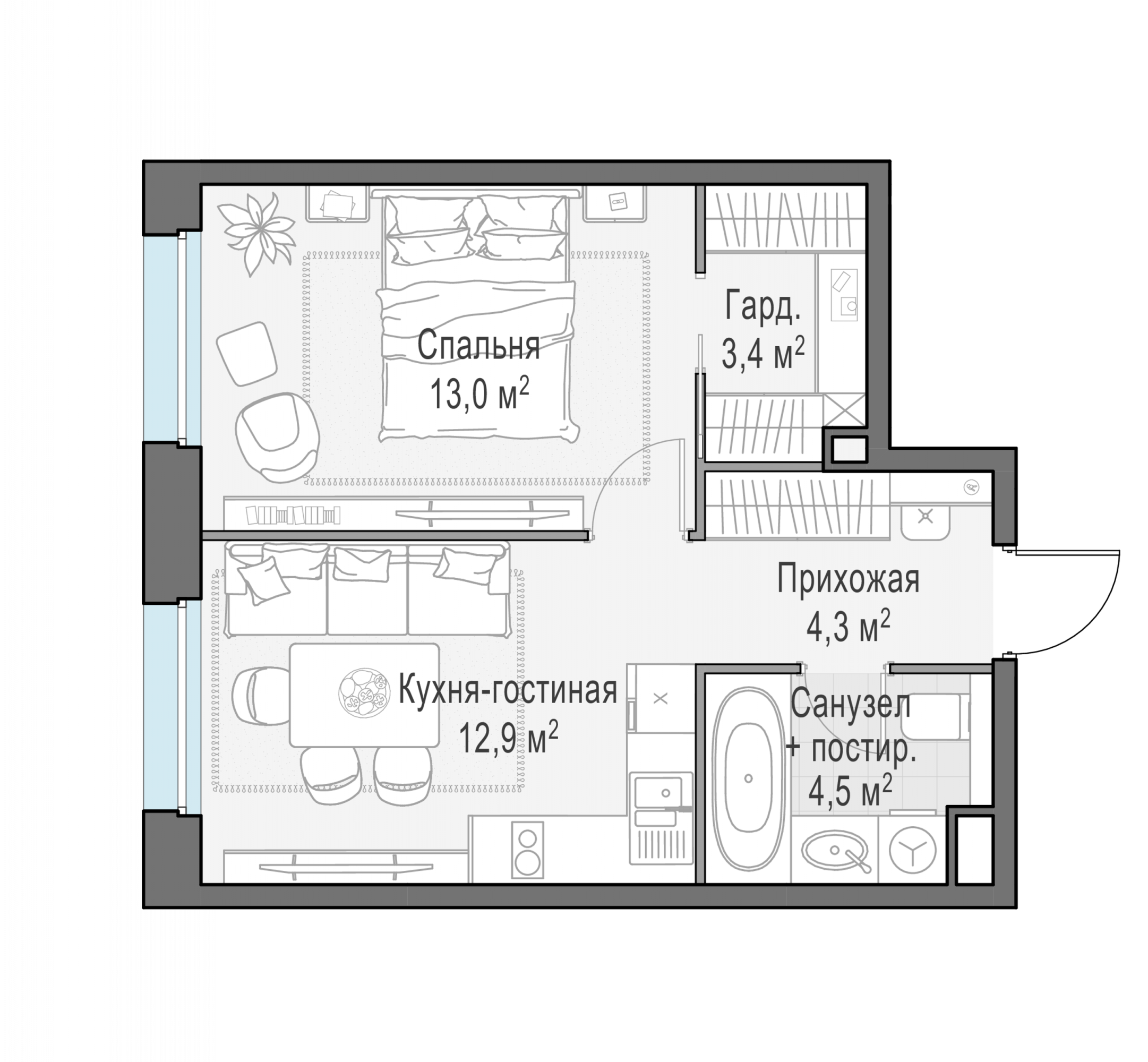 Представленные планировочные решения носят иллюстративный характер. Застройщик передаёт объект с планировкой, указанной в договоре участия в долевом строительстве. Любая перепланировка должна соответствовать требованиям государственных органов.