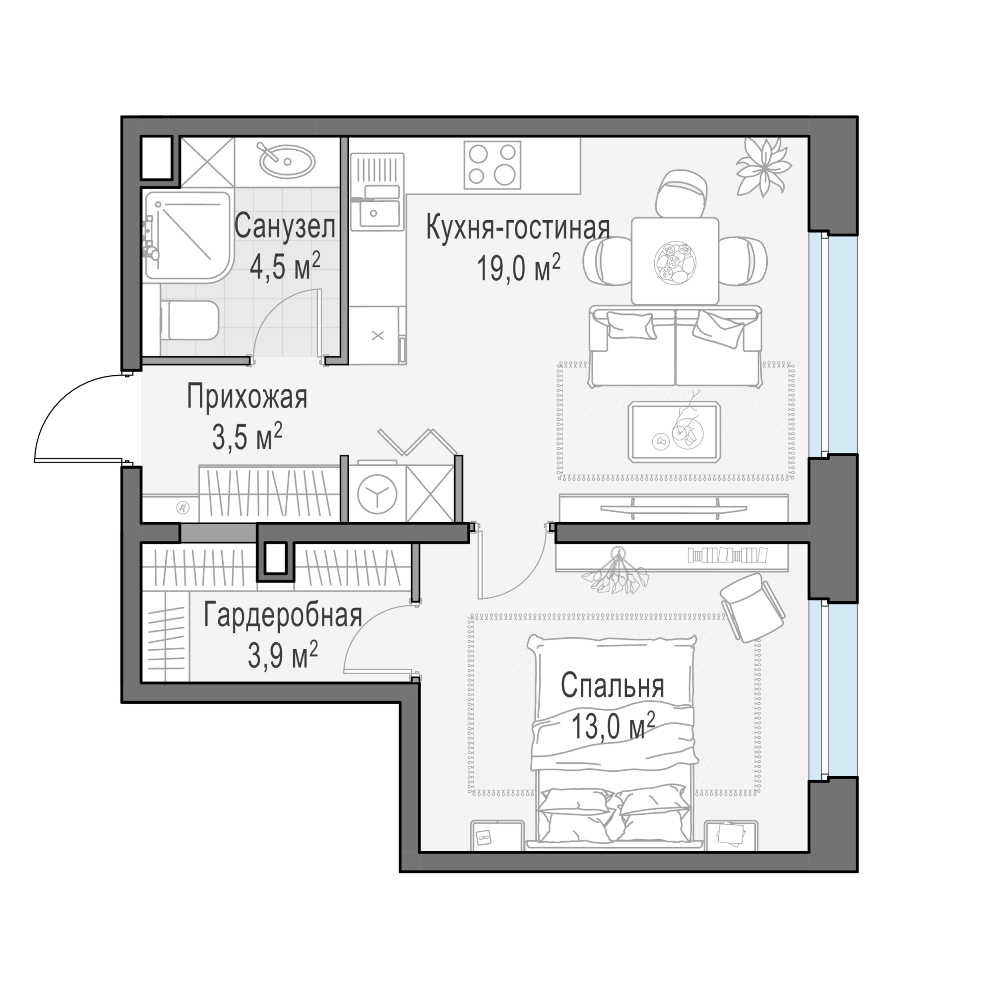 Представленные планировочные решения носят иллюстративный характер. Застройщик передаёт объект с планировкой, указанной в договоре участия в долевом строительстве. Любая перепланировка должна соответствовать требованиям государственных органов.