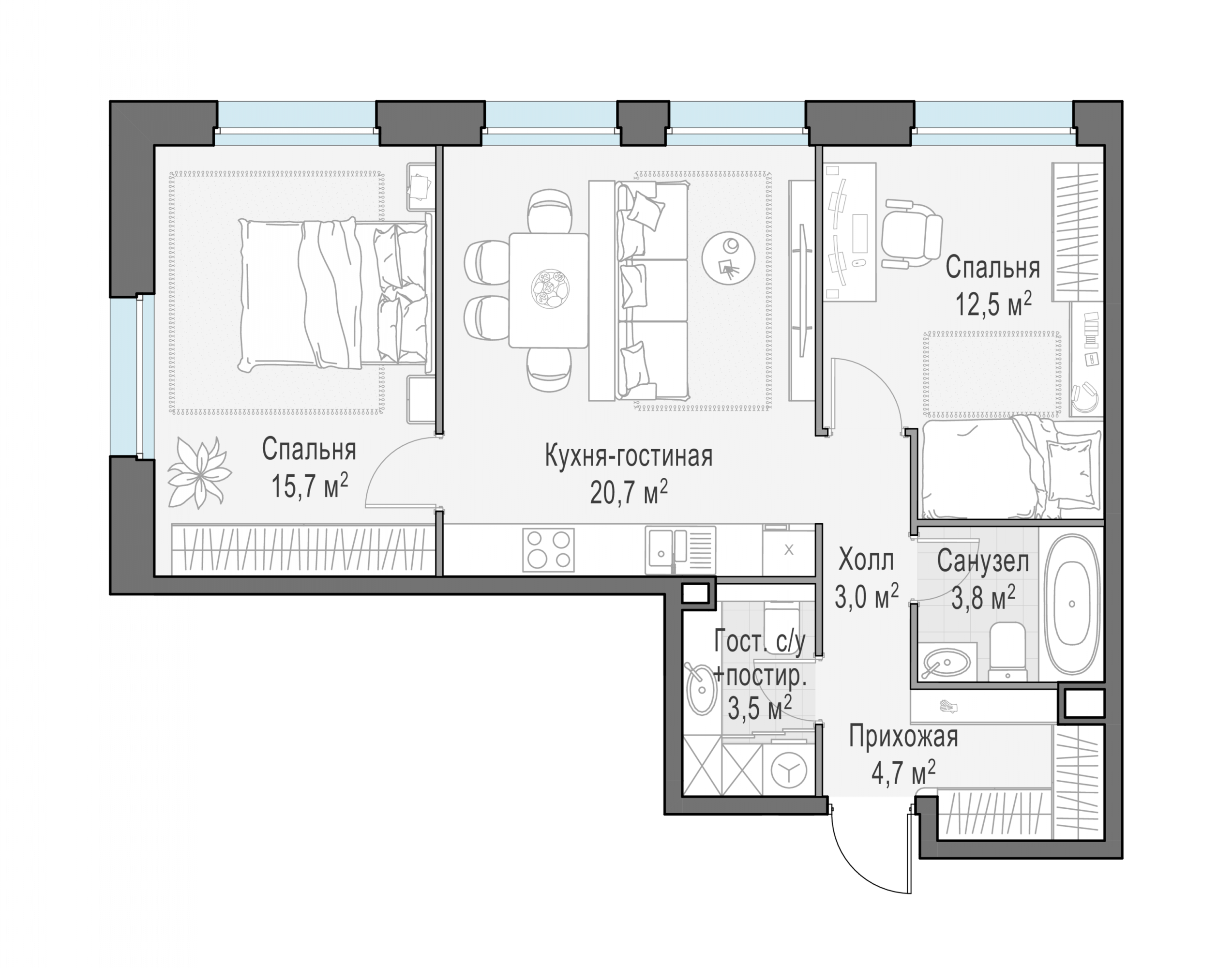Представленные планировочные решения носят иллюстративный характер. Застройщик передаёт объект с планировкой, указанной в договоре участия в долевом строительстве. Любая перепланировка должна соответствовать требованиям государственных органов.