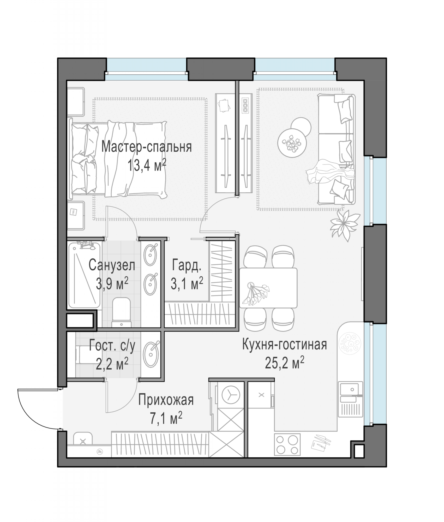 Представленные планировочные решения носят иллюстративный характер. Застройщик передаёт объект с планировкой, указанной в договоре участия в долевом строительстве. Любая перепланировка должна соответствовать требованиям государственных органов.