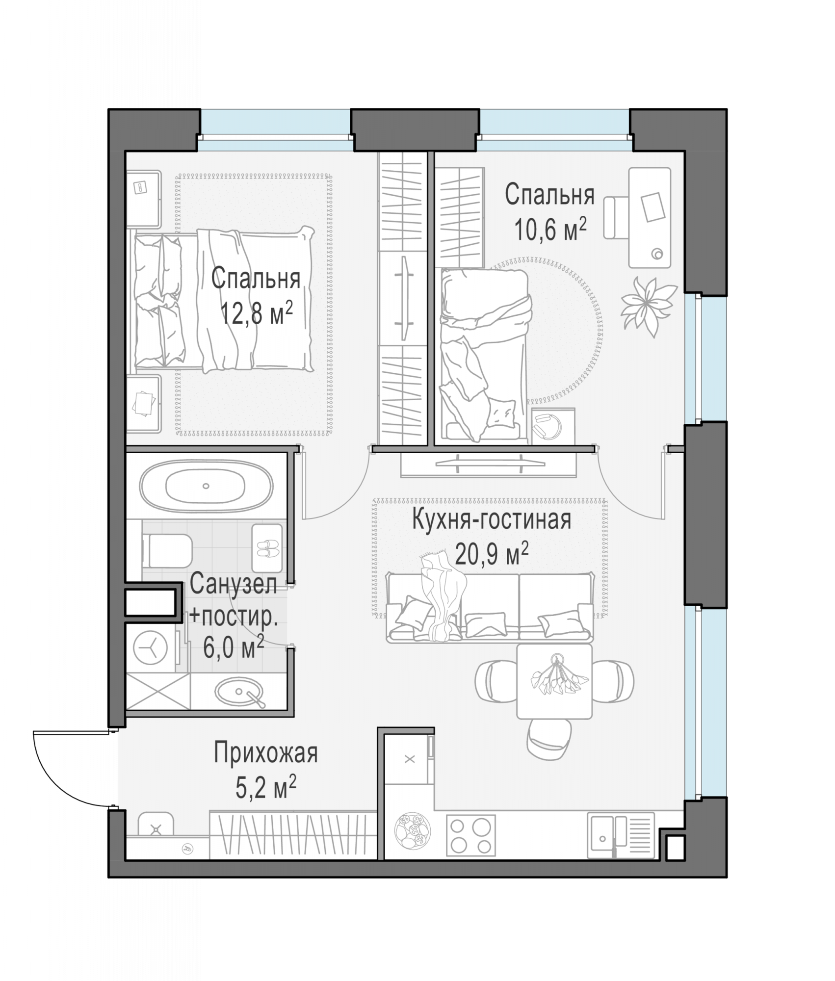 Представленные планировочные решения носят иллюстративный характер. Застройщик передаёт объект с планировкой, указанной в договоре участия в долевом строительстве. Любая перепланировка должна соответствовать требованиям государственных органов.