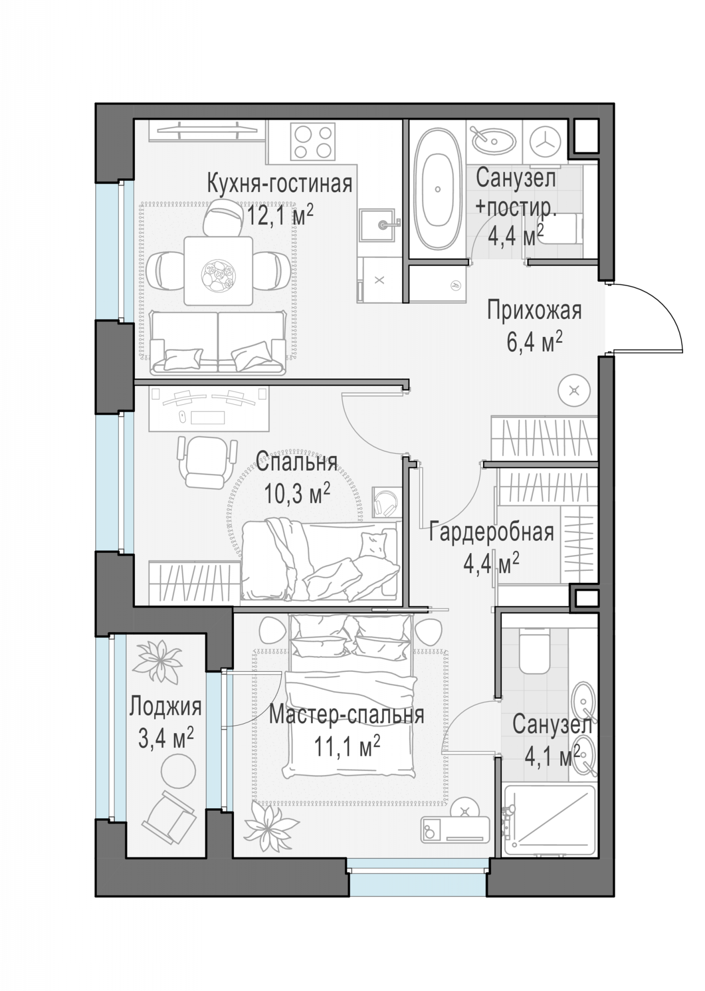 Представленные планировочные решения носят иллюстративный характер. Застройщик передаёт объект с планировкой, указанной в договоре участия в долевом строительстве. Любая перепланировка должна соответствовать требованиям государственных органов.