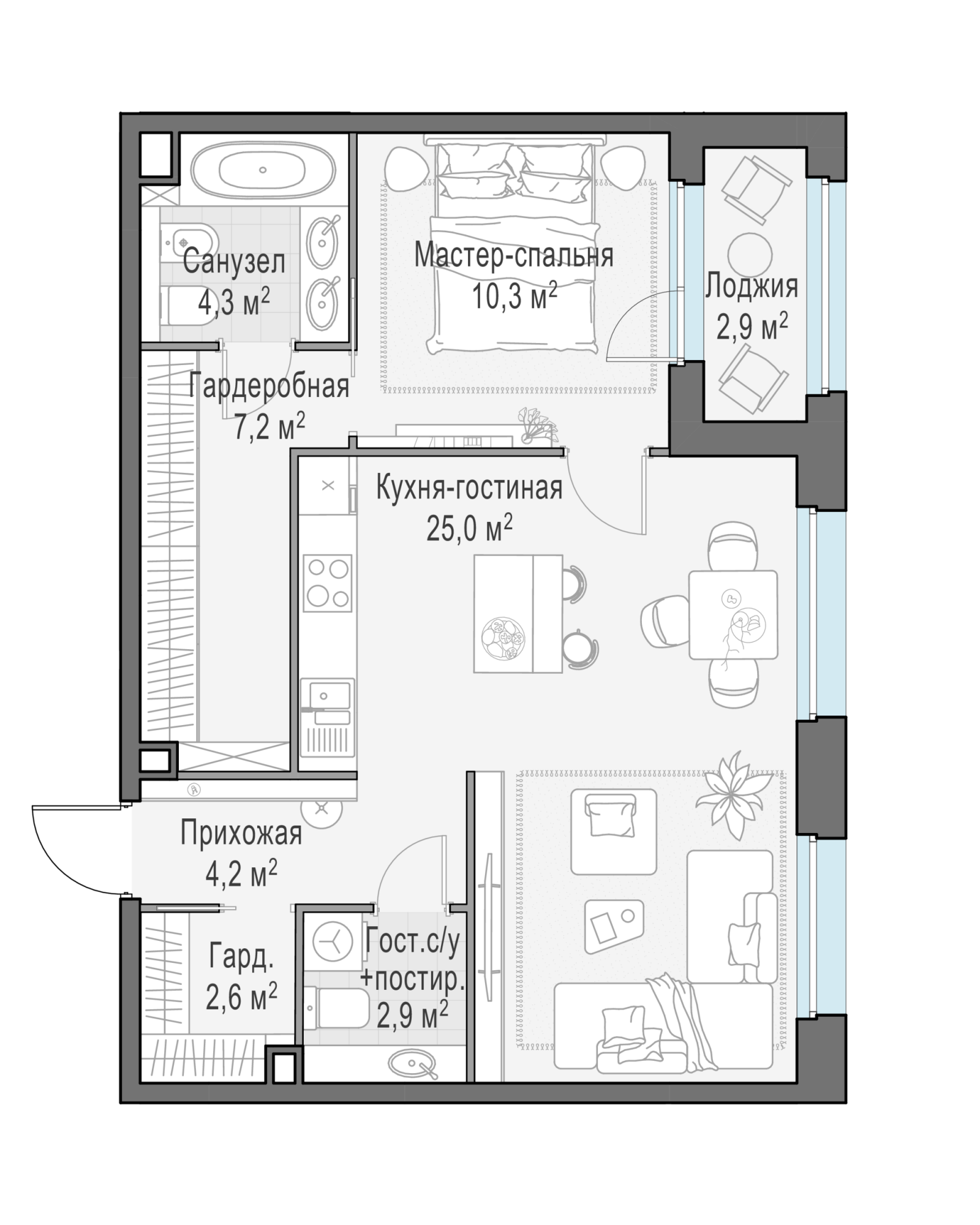 Представленные планировочные решения носят иллюстративный характер. Застройщик передаёт объект с планировкой, указанной в договоре участия в долевом строительстве. Любая перепланировка должна соответствовать требованиям государственных органов.