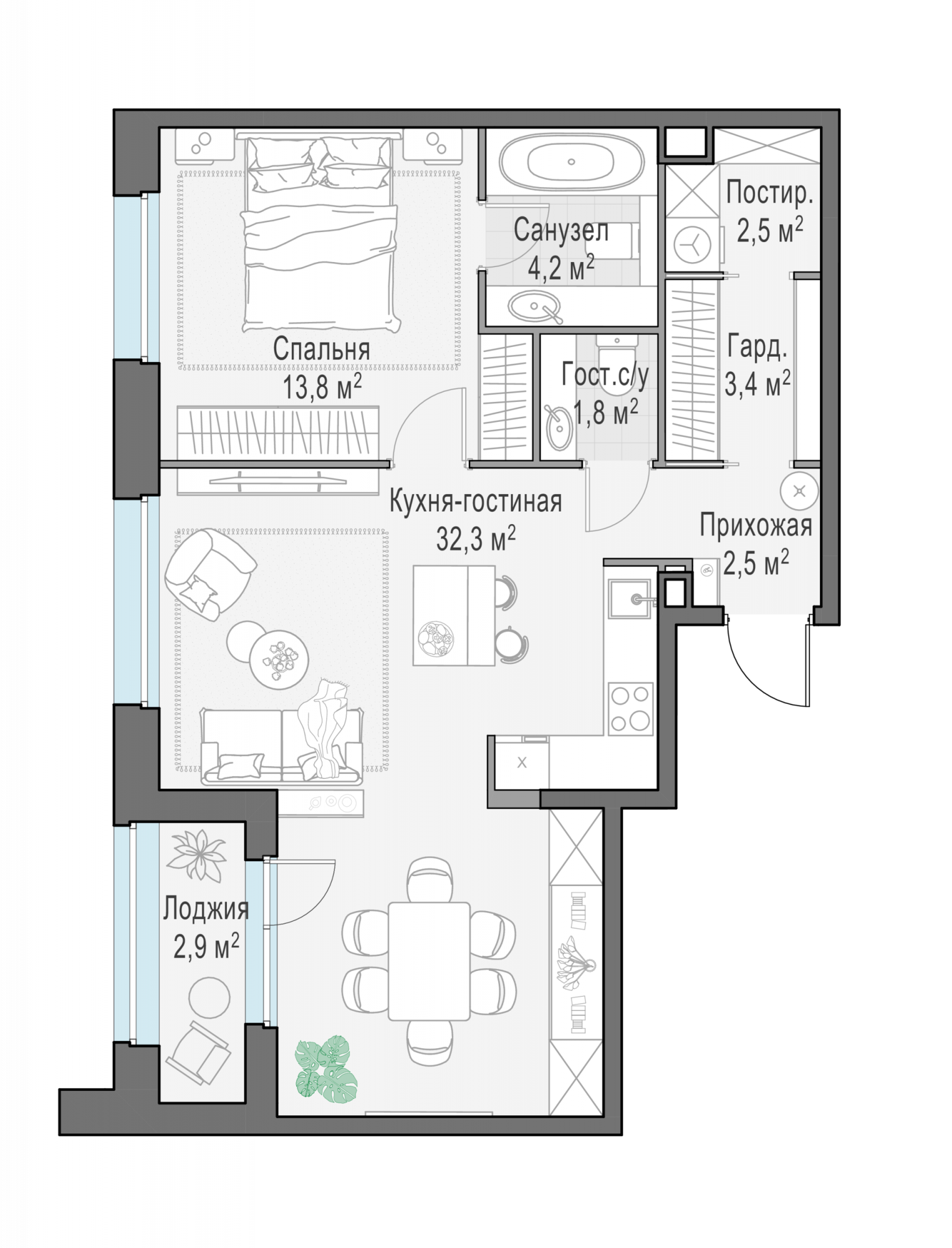 Представленные планировочные решения носят иллюстративный характер. Застройщик передаёт объект с планировкой, указанной в договоре участия в долевом строительстве. Любая перепланировка должна соответствовать требованиям государственных органов.