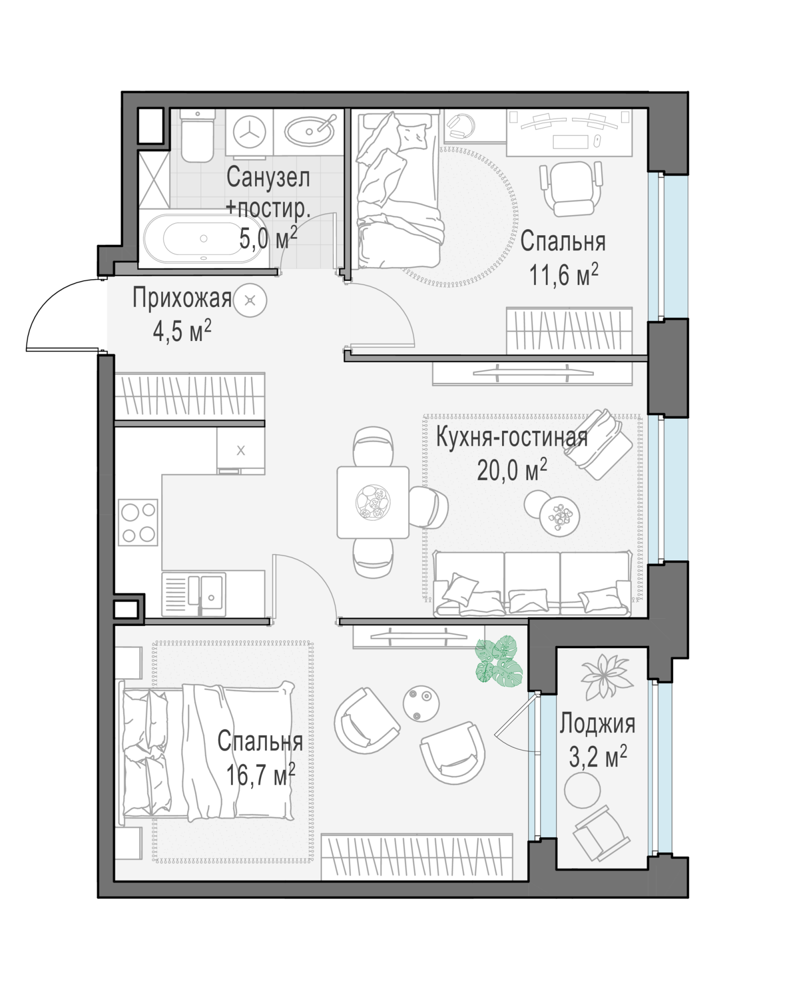 Представленные планировочные решения носят иллюстративный характер. Застройщик передаёт объект с планировкой, указанной в договоре участия в долевом строительстве. Любая перепланировка должна соответствовать требованиям государственных органов.