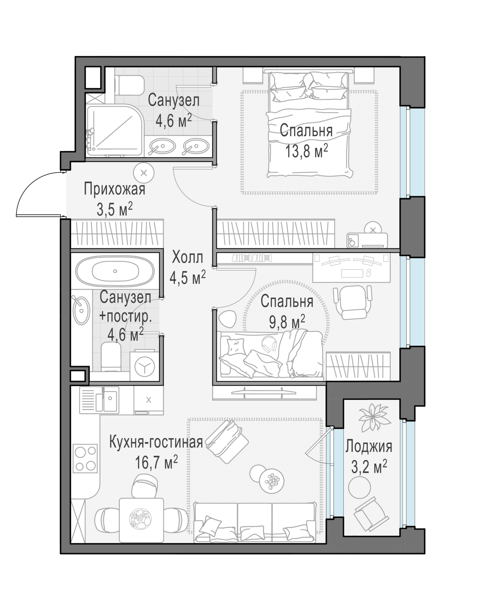 Представленные планировочные решения носят иллюстративный характер. Застройщик передаёт объект с планировкой, указанной в договоре участия в долевом строительстве. Любая перепланировка должна соответствовать требованиям государственных органов.