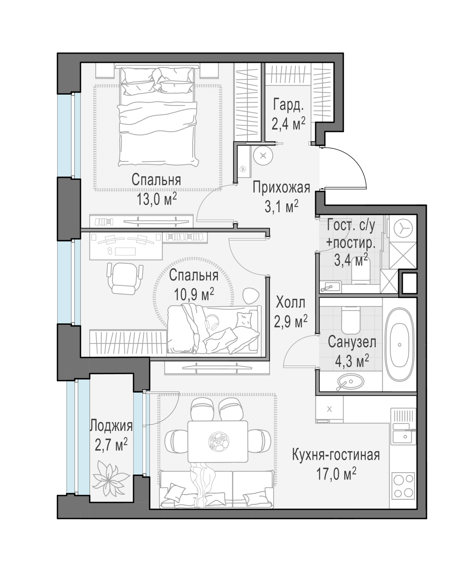 Представленные планировочные решения носят иллюстративный характер. Застройщик передаёт объект с планировкой, указанной в договоре участия в долевом строительстве. Любая перепланировка должна соответствовать требованиям государственных органов.