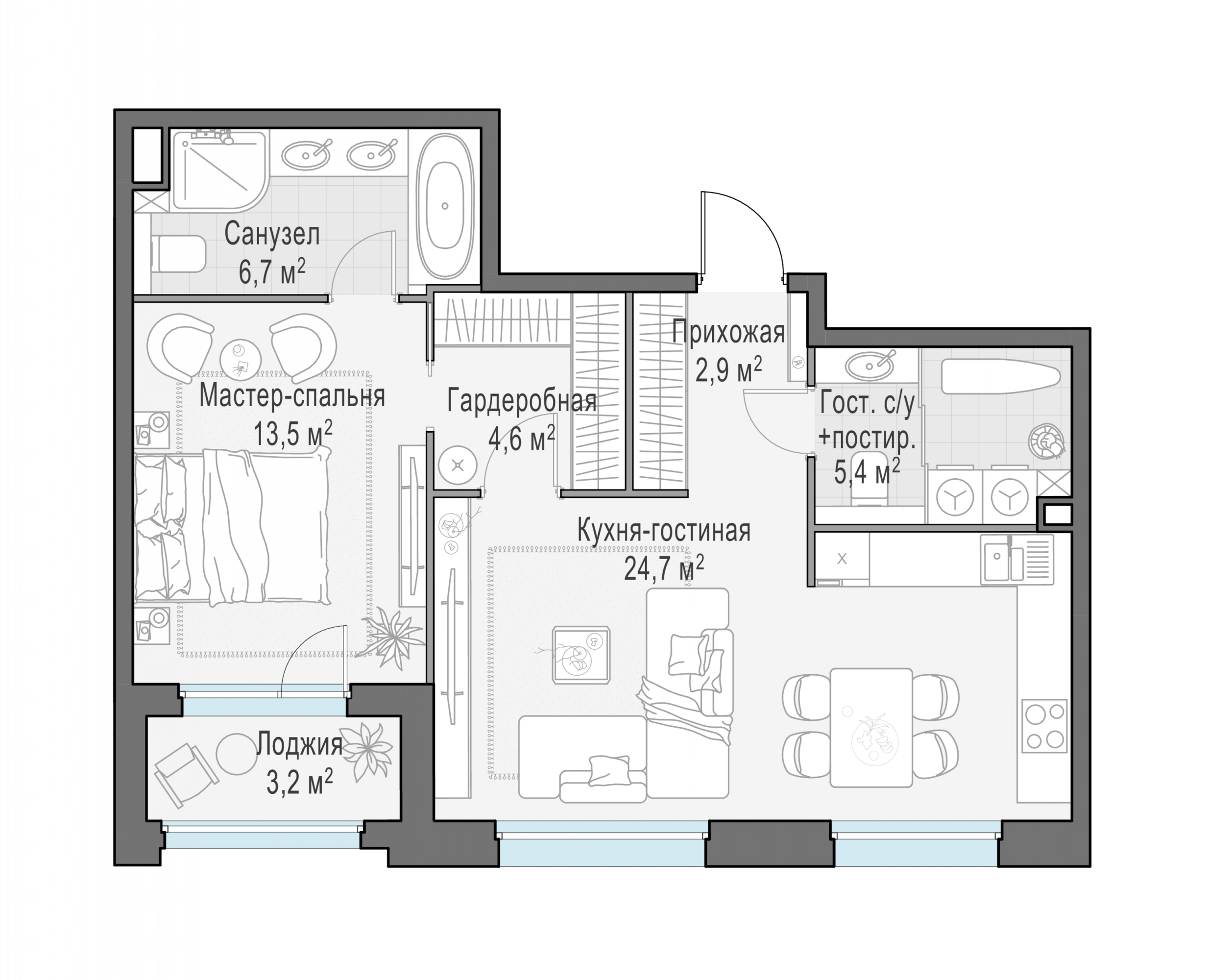 Представленные планировочные решения носят иллюстративный характер. Застройщик передаёт объект с планировкой, указанной в договоре участия в долевом строительстве. Любая перепланировка должна соответствовать требованиям государственных органов.