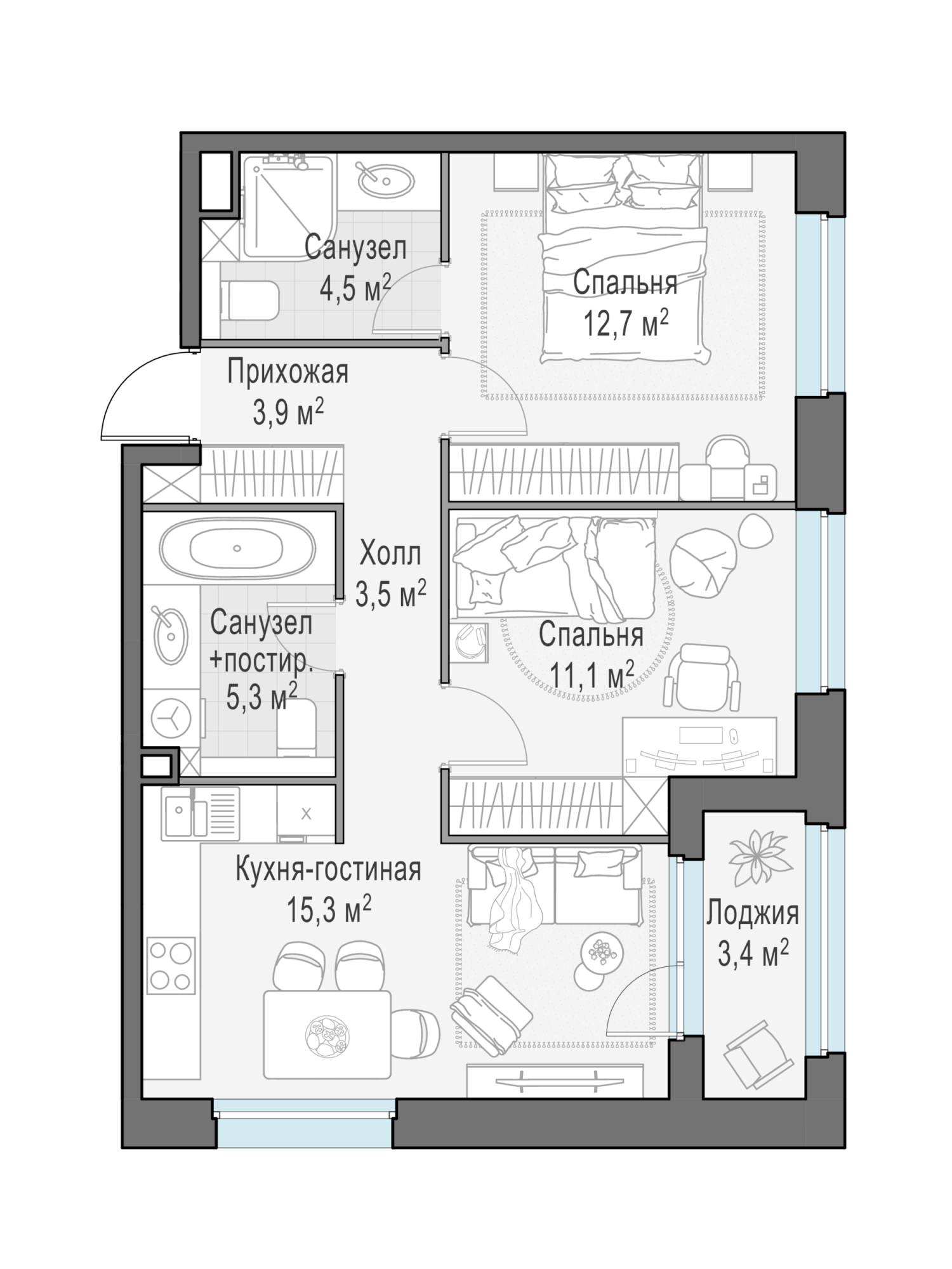 Представленные планировочные решения носят иллюстративный характер. Застройщик передаёт объект с планировкой, указанной в договоре участия в долевом строительстве. Любая перепланировка должна соответствовать требованиям государственных органов.