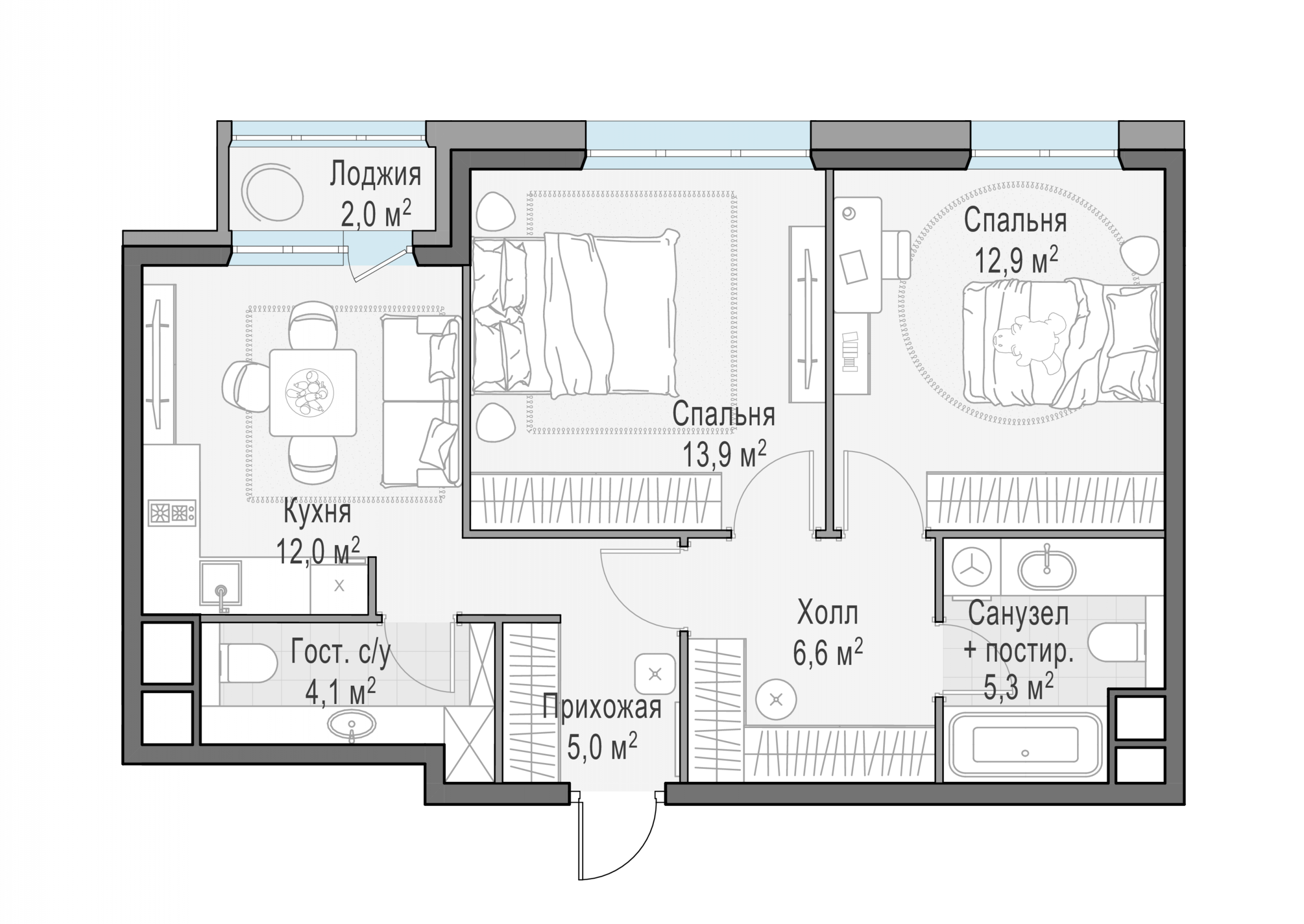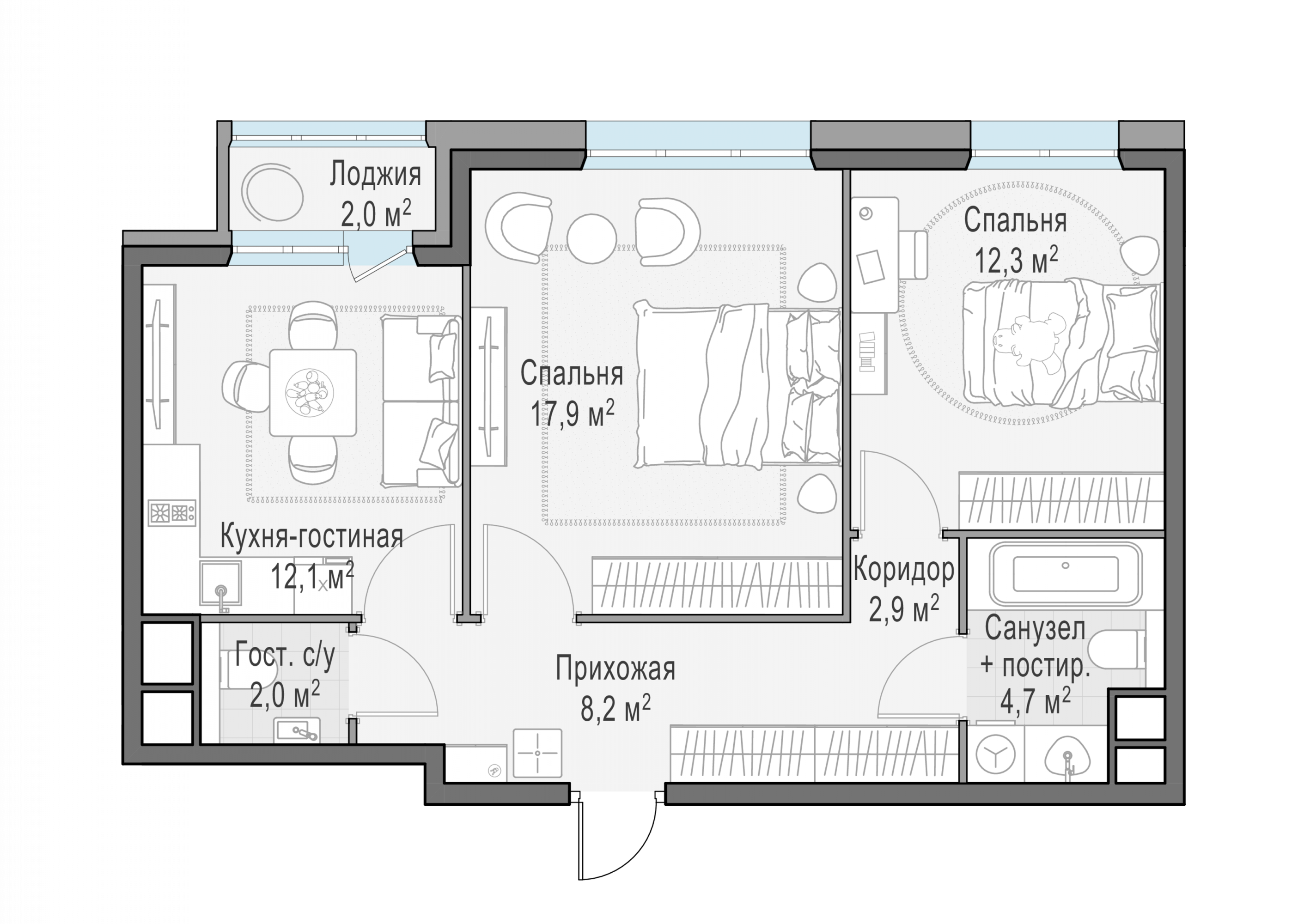 Представленные планировочные решения носят иллюстративный характер. Застройщик передаёт объект с планировкой, указанной в договоре участия в долевом строительстве. Любая перепланировка должна соответствовать требованиям государственных органов.