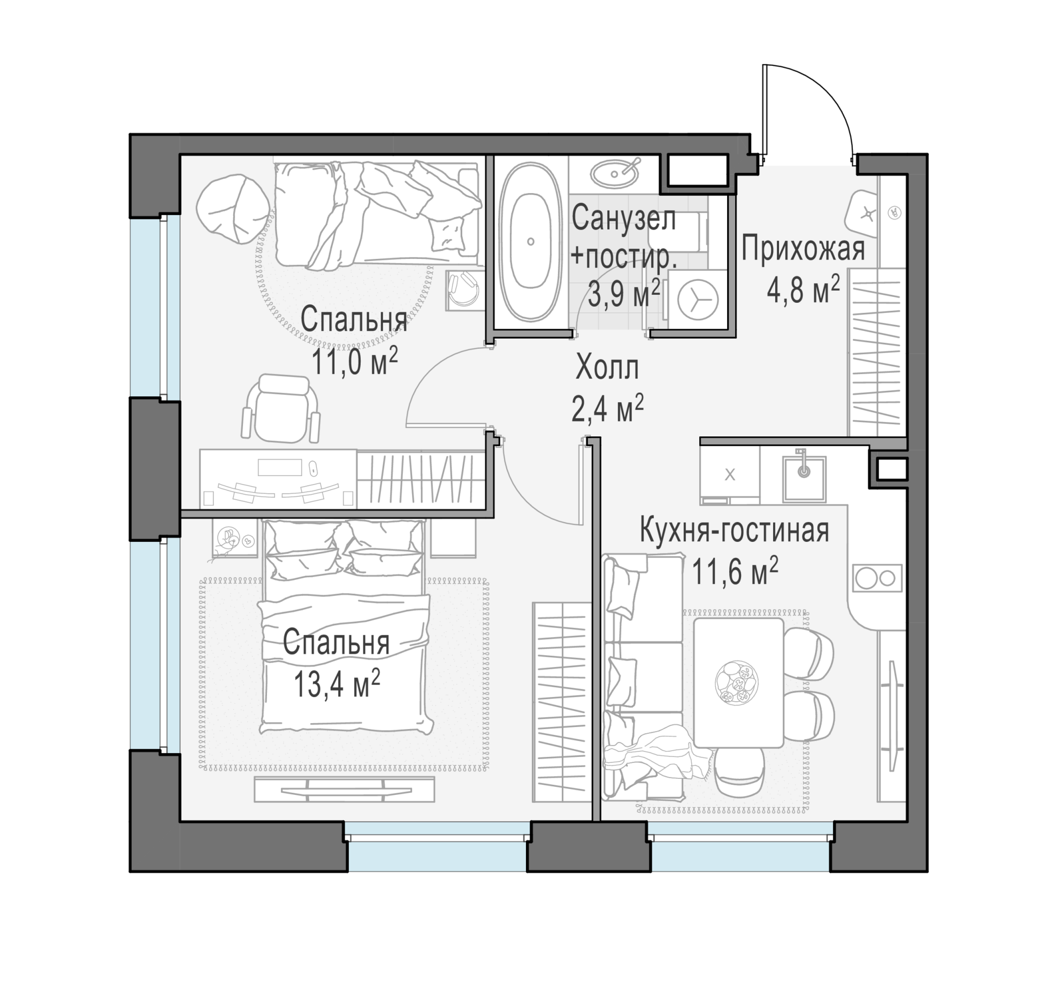 Представленные планировочные решения носят иллюстративный характер. Застройщик передаёт объект с планировкой, указанной в договоре участия в долевом строительстве. Любая перепланировка должна соответствовать требованиям государственных органов.