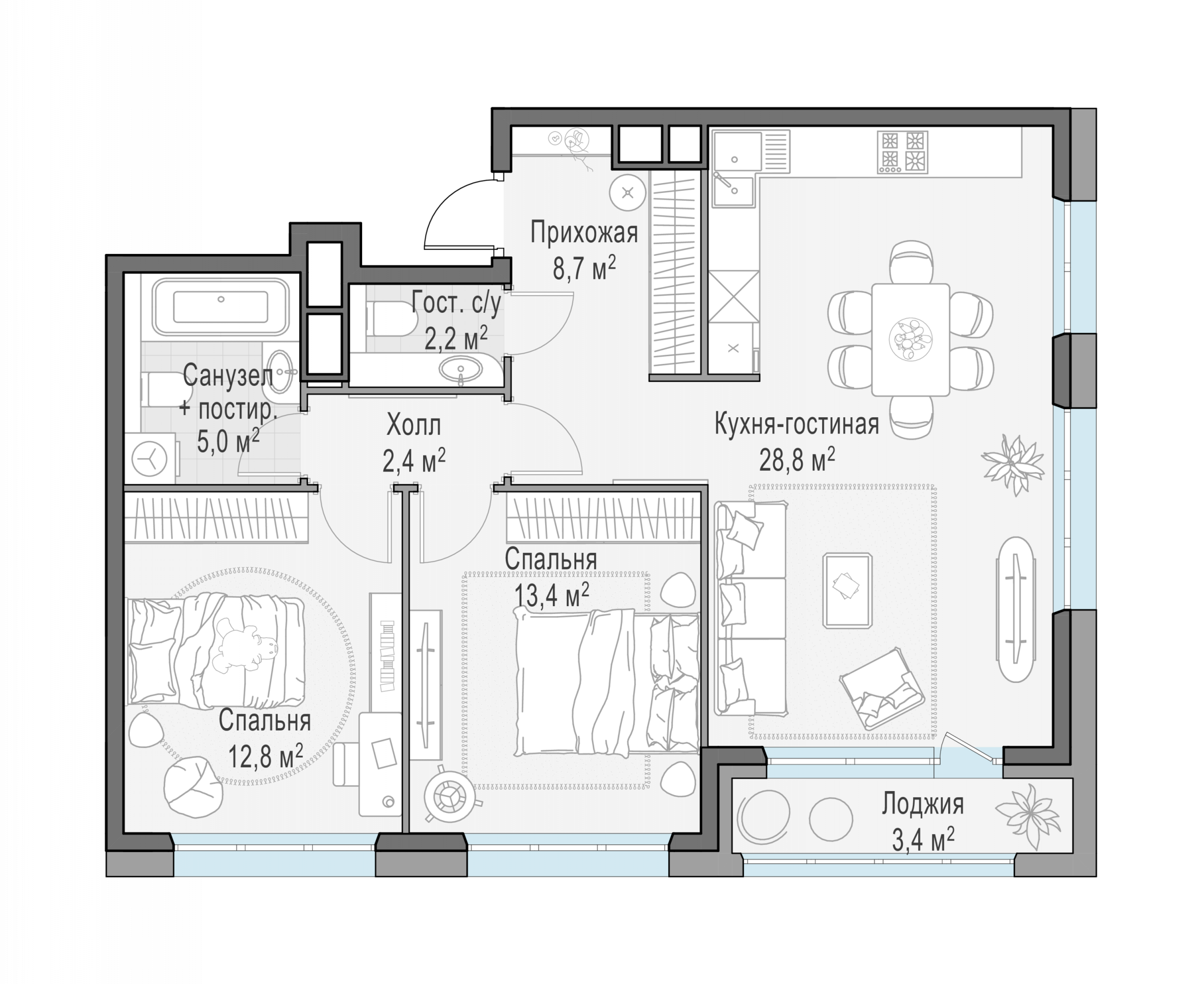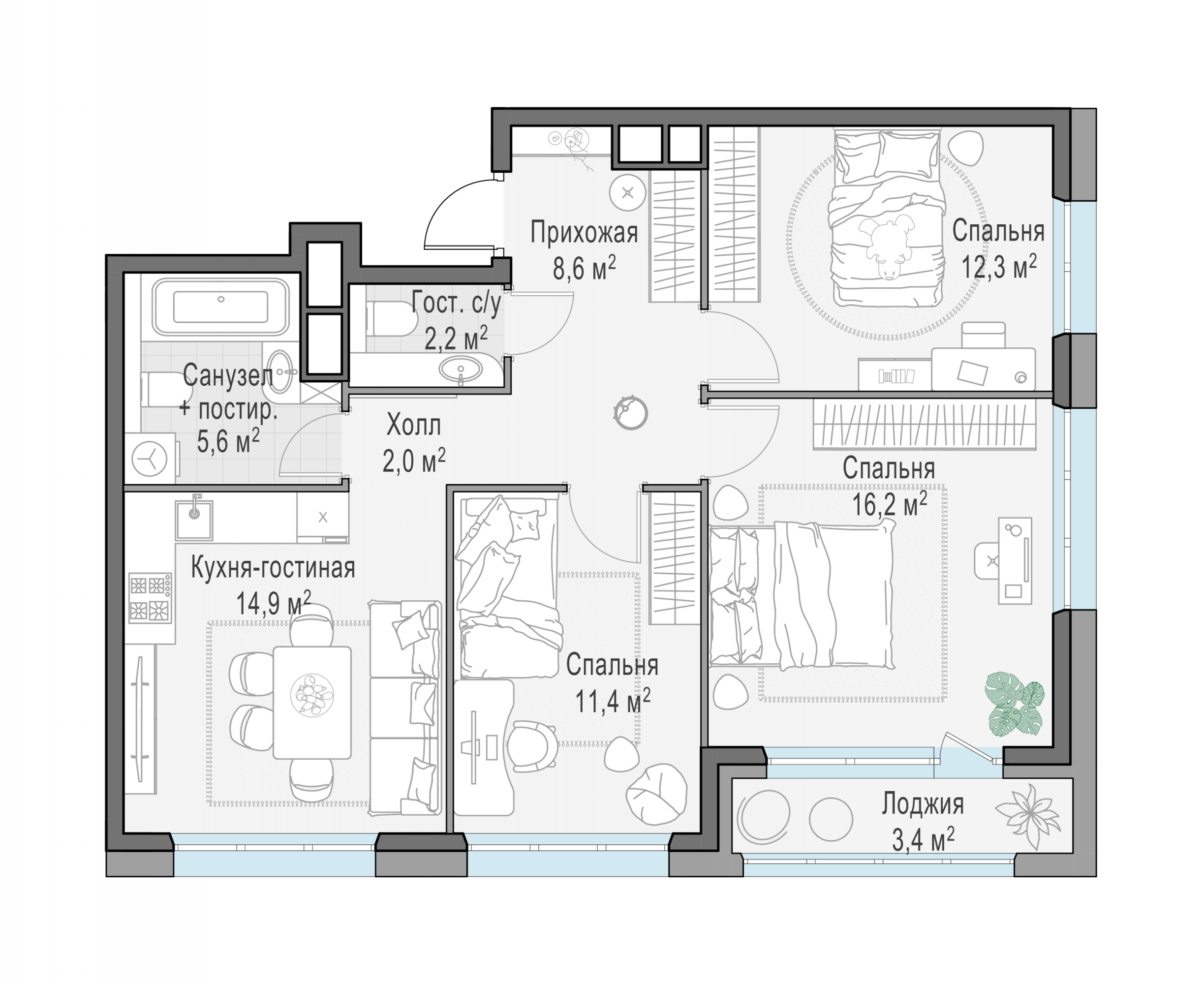 Представленные планировочные решения носят иллюстративный характер. Застройщик передаёт объект с планировкой, указанной в договоре участия в долевом строительстве. Любая перепланировка должна соответствовать требованиям государственных органов.