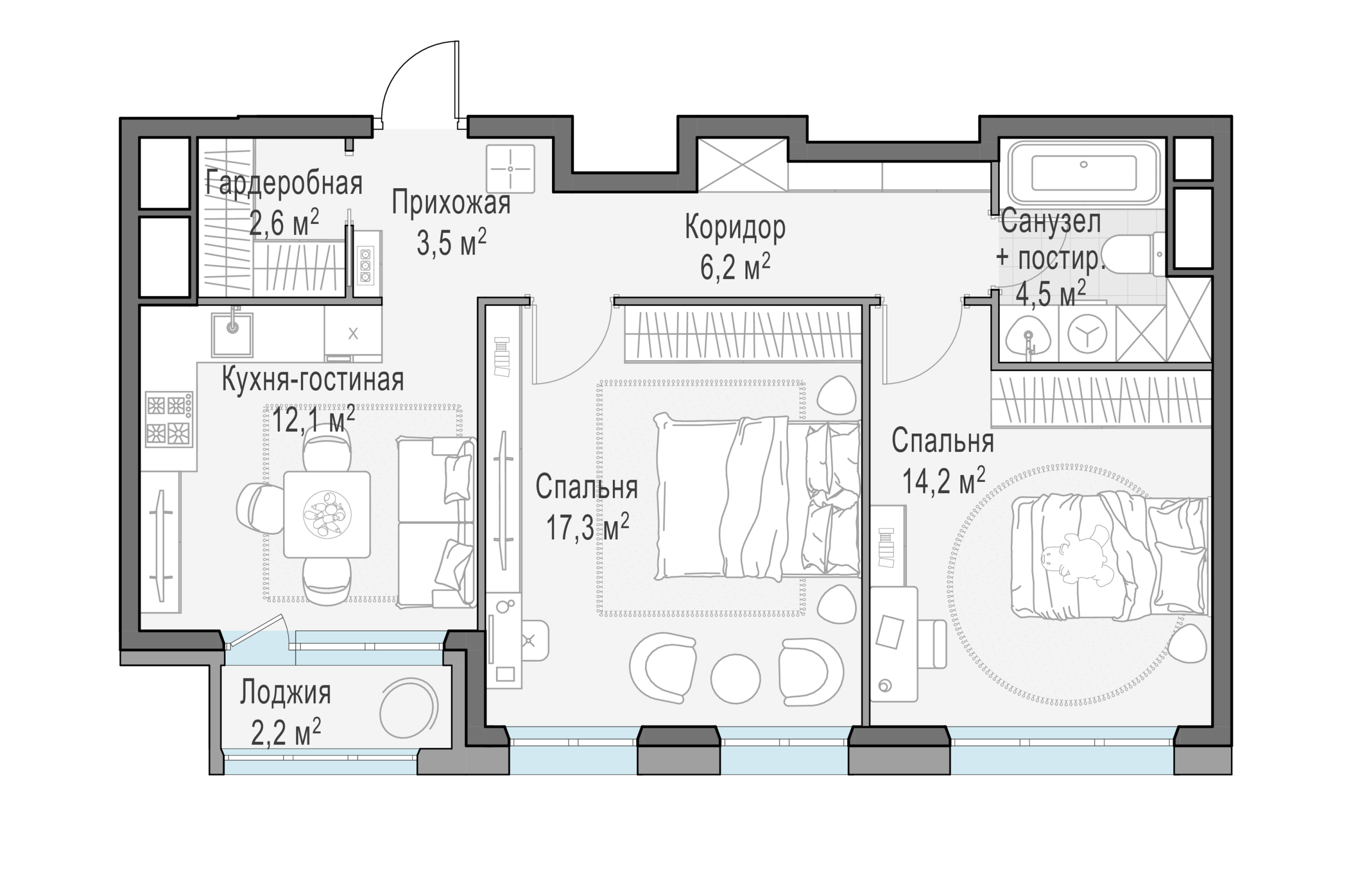 Представленные планировочные решения носят иллюстративный характер. Застройщик передаёт объект с планировкой, указанной в договоре участия в долевом строительстве. Любая перепланировка должна соответствовать требованиям государственных органов.