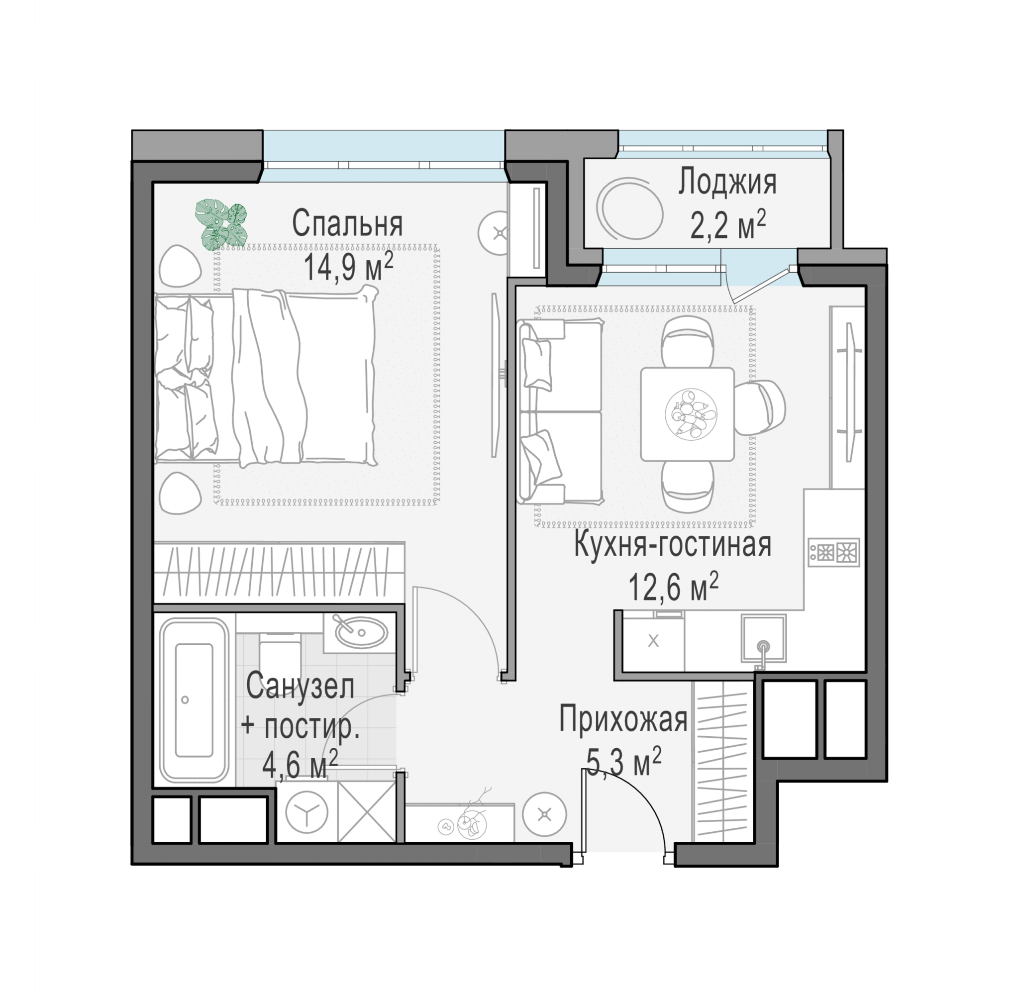 Представленные планировочные решения носят иллюстративный характер. Застройщик передаёт объект с планировкой, указанной в договоре участия в долевом строительстве. Любая перепланировка должна соответствовать требованиям государственных органов.