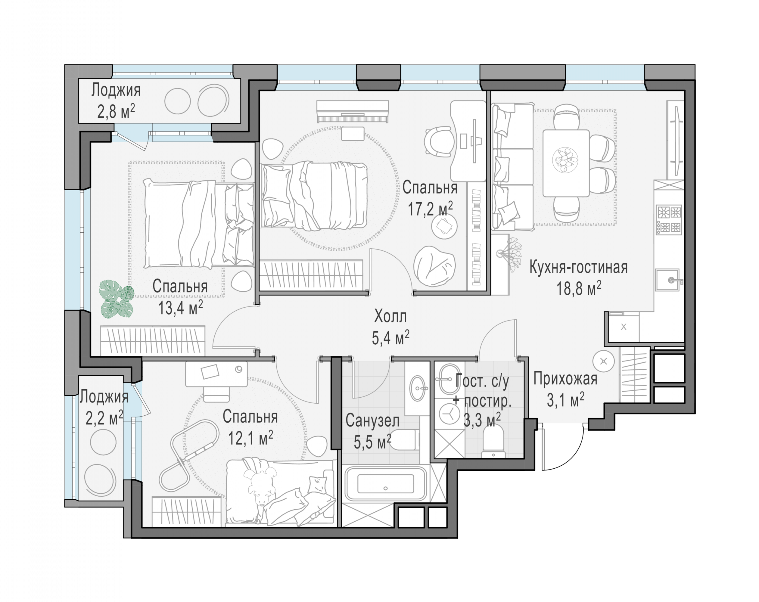Представленные планировочные решения носят иллюстративный характер. Застройщик передаёт объект с планировкой, указанной в договоре участия в долевом строительстве. Любая перепланировка должна соответствовать требованиям государственных органов.