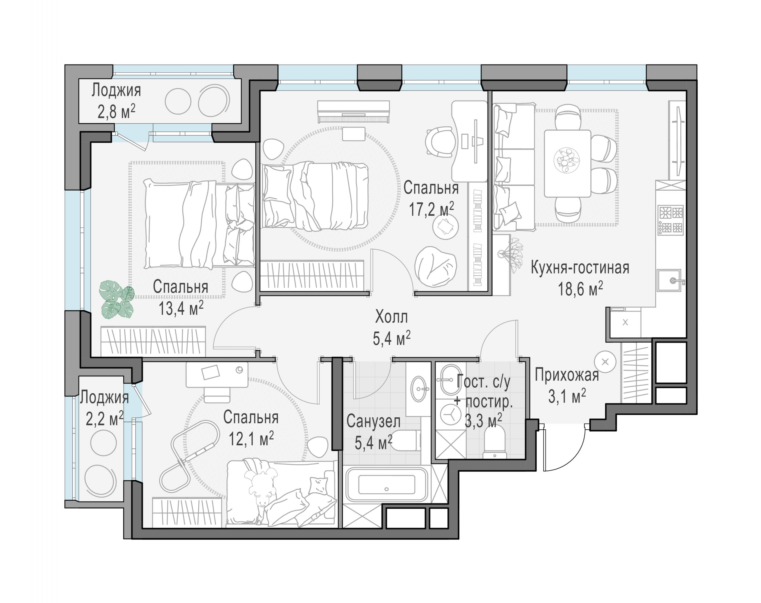 Представленные планировочные решения носят иллюстративный характер. Застройщик передаёт объект с планировкой, указанной в договоре участия в долевом строительстве. Любая перепланировка должна соответствовать требованиям государственных органов.