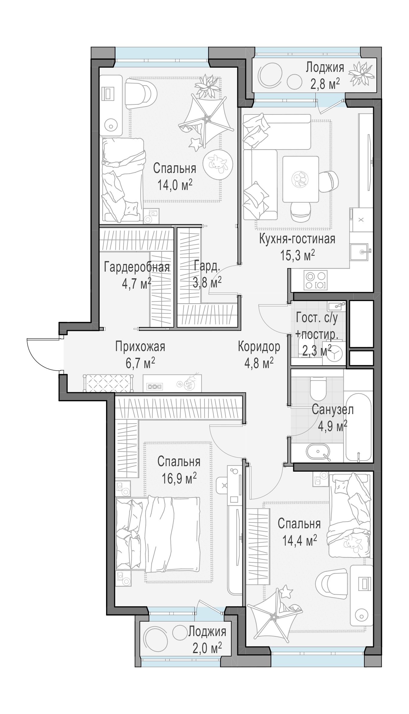 Представленные планировочные решения носят иллюстративный характер. Застройщик передаёт объект с планировкой, указанной в договоре участия в долевом строительстве. Любая перепланировка должна соответствовать требованиям государственных органов.
