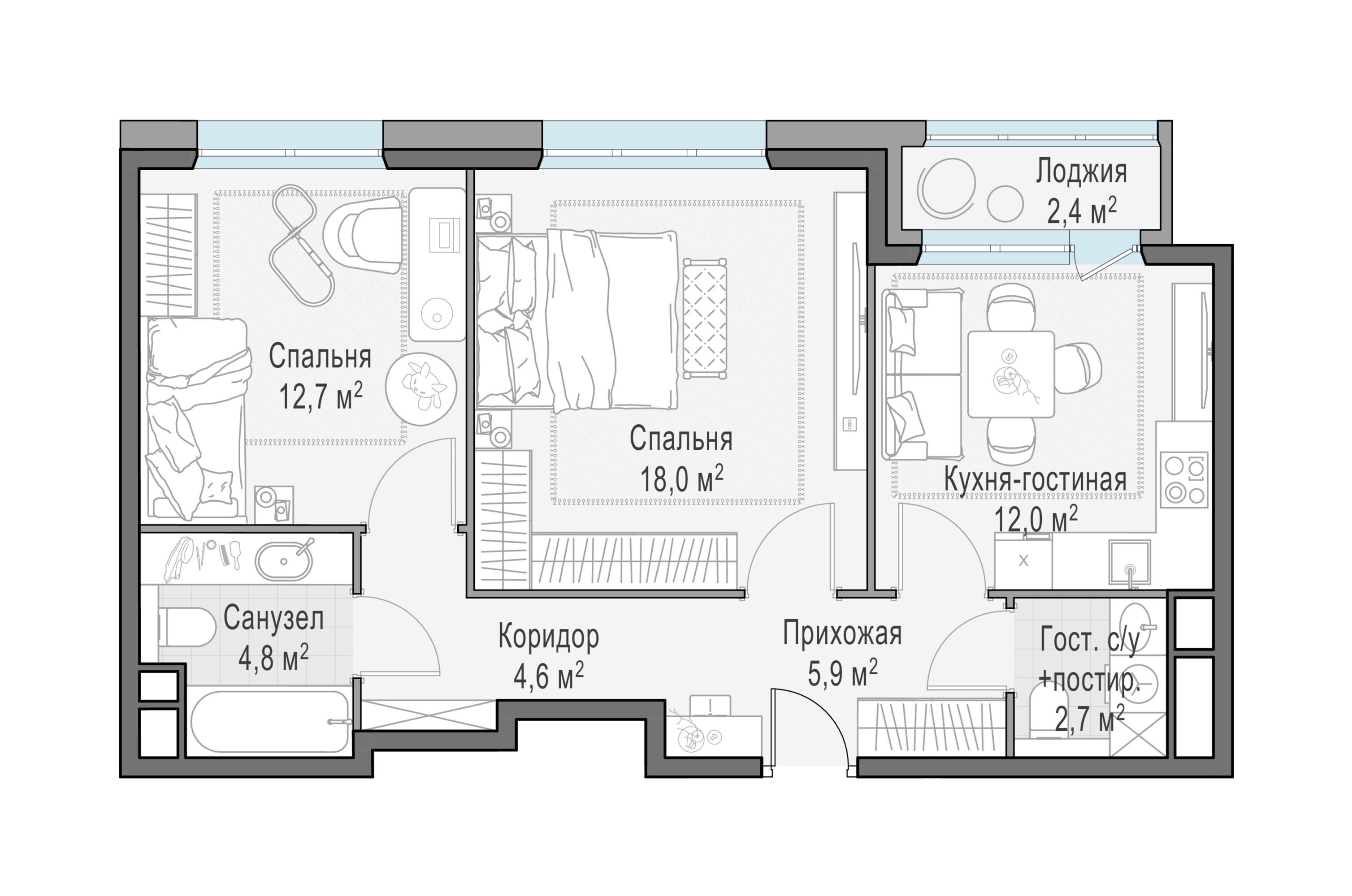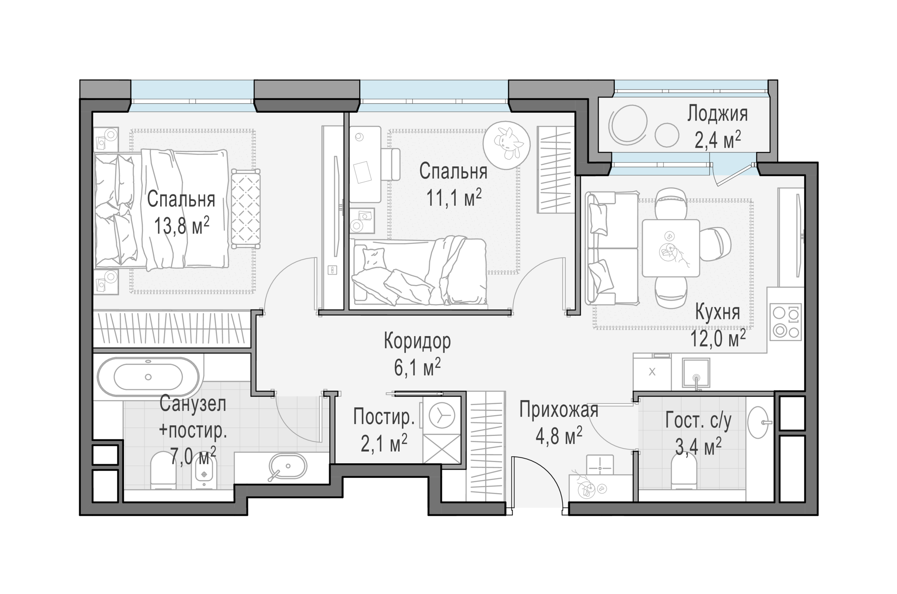 Представленные планировочные решения носят иллюстративный характер. Застройщик передаёт объект с планировкой, указанной в договоре участия в долевом строительстве. Любая перепланировка должна соответствовать требованиям государственных органов.