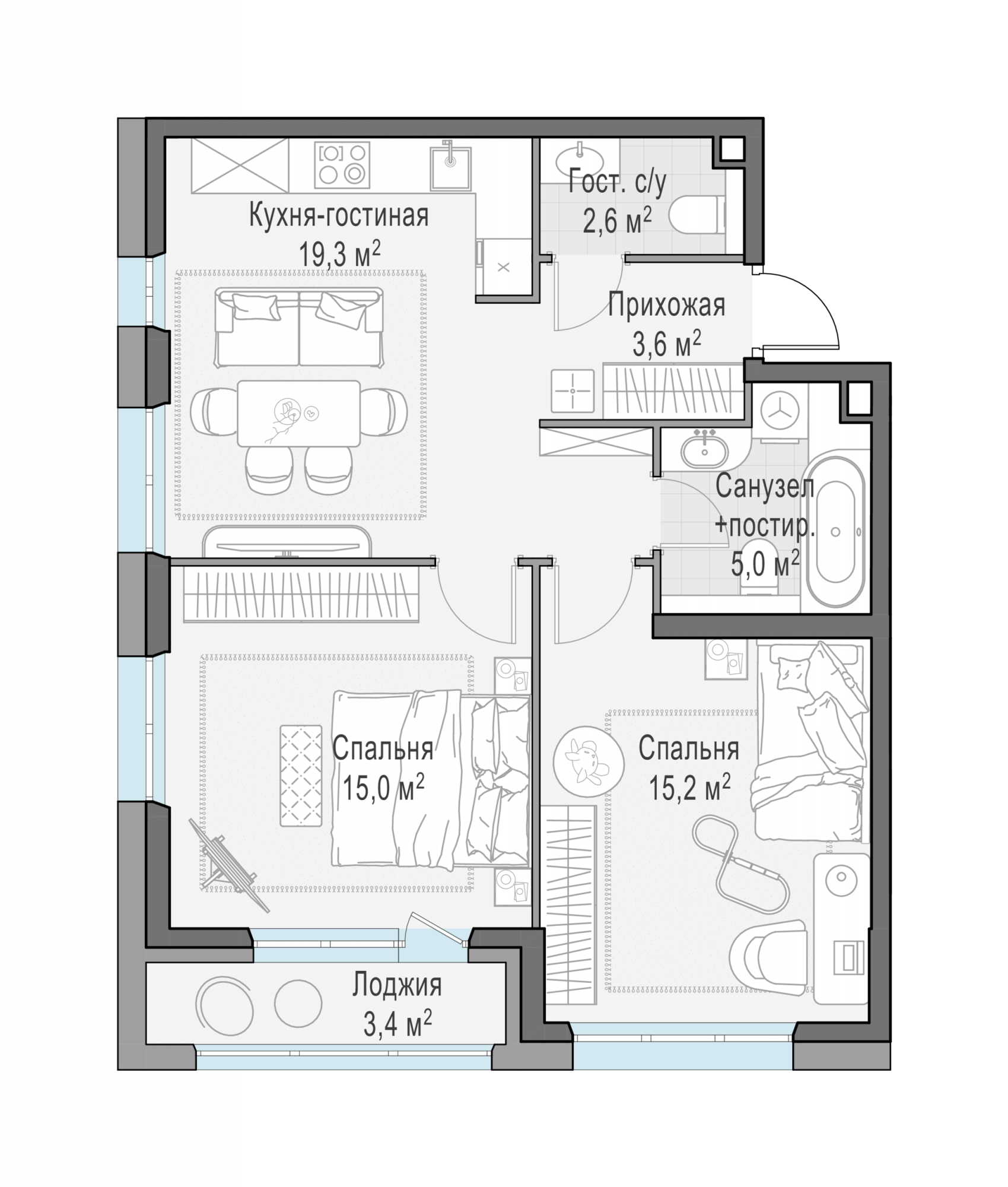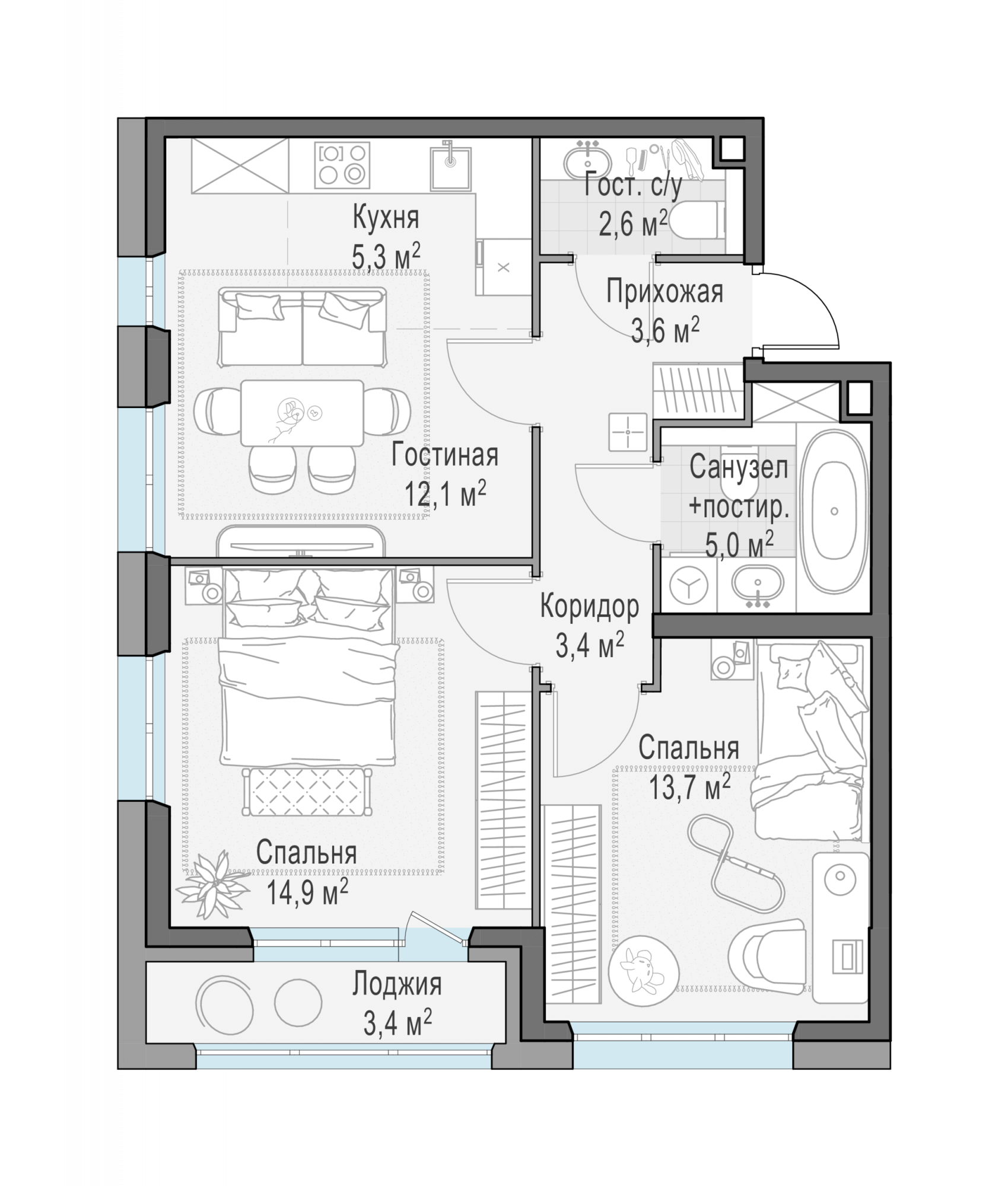Представленные планировочные решения носят иллюстративный характер. Застройщик передаёт объект с планировкой, указанной в договоре участия в долевом строительстве. Любая перепланировка должна соответствовать требованиям государственных органов.